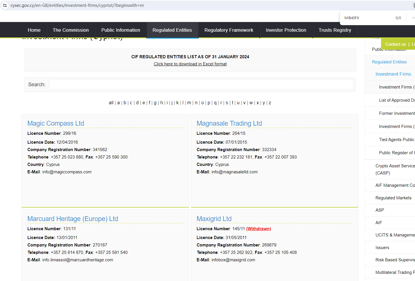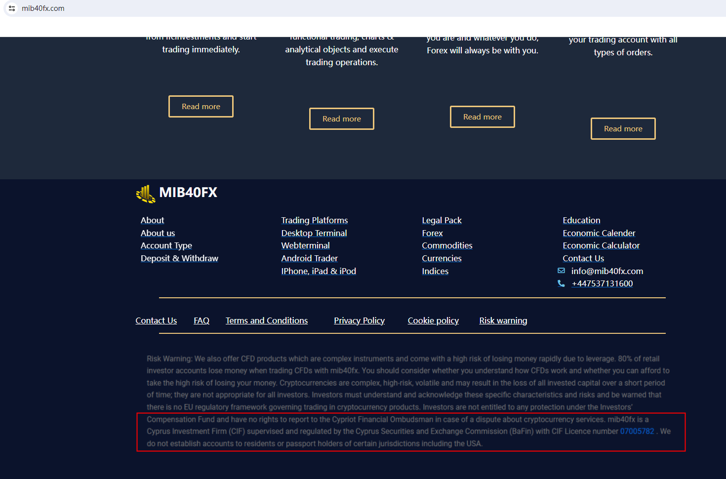 According to its website, it claims to be registered with Cyprus Investment Firm (CIF) and regulated by the Cyprus Securities and Exchange Commission (CySEC). However, no relevant information was found after searching. It is also worth noting that the abbreviation of CySEC is incorrectly written as BaFin on the website, which is very unprofessional and is also a dangerous signal. What's more, in their statement, they said that they were regulated by CySEC and gave a hyperlink to the regulatory number, but this hyperlink was connected to the Company House (CH) page. This abnormal situation already indicates that there is a problem with their regulatory statement.In addition, the Commissione Nazionale per le Società e la Borsa (CONSOB) added MIB40FX to its warning list as a fraudulent trading platform. In essence, MIB40FX is not regulated by any governing body. Entrusting it with investors' funds is highly risky, as there are no legal protections in place to safeguard the funds.MIB40FX appears to be a scam.
