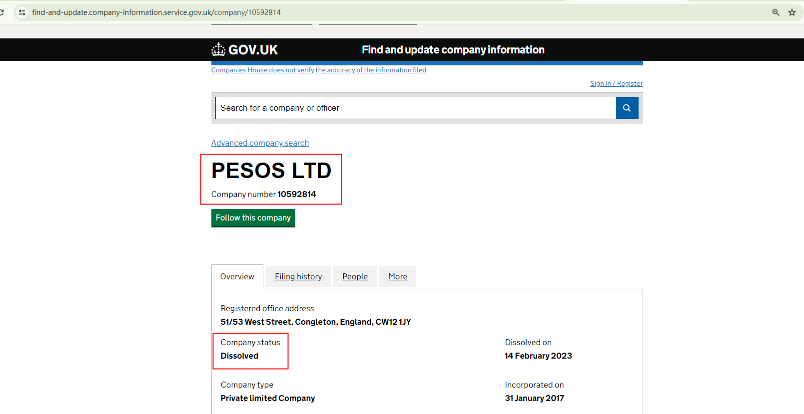 MINERSFINANCE claims to be registered in the UK, but hasn't provided specific address. This lack of transparency is a red flag. The company number 10592814 it alleges is linked to Pesos Ltd in the register of the Companies House (CH), an entity, however, that has been dissolved. In addition, there isn't evidence of potential association between MINERSFINANCE and Pesos Ltd.