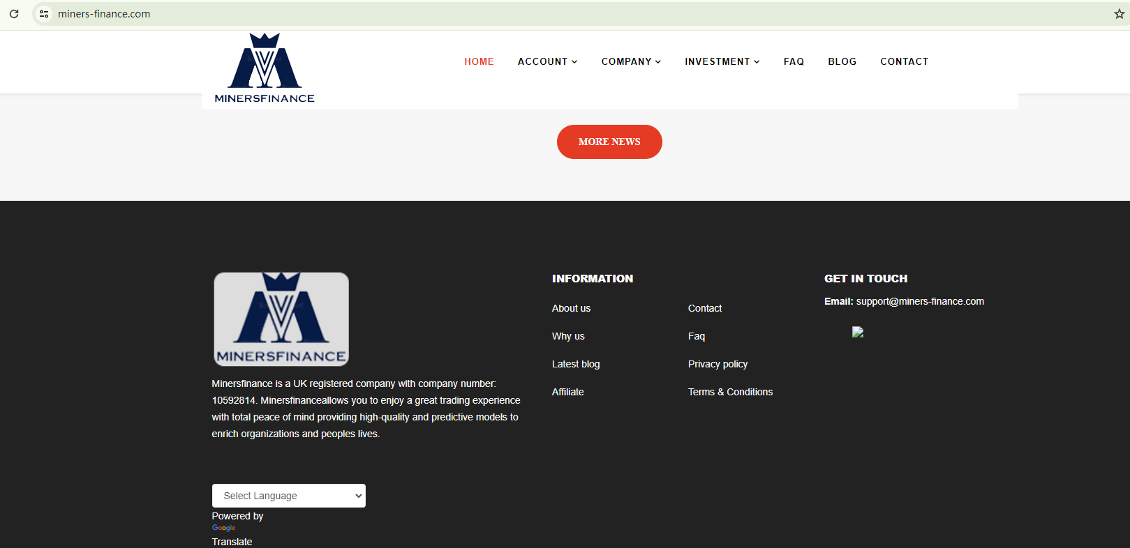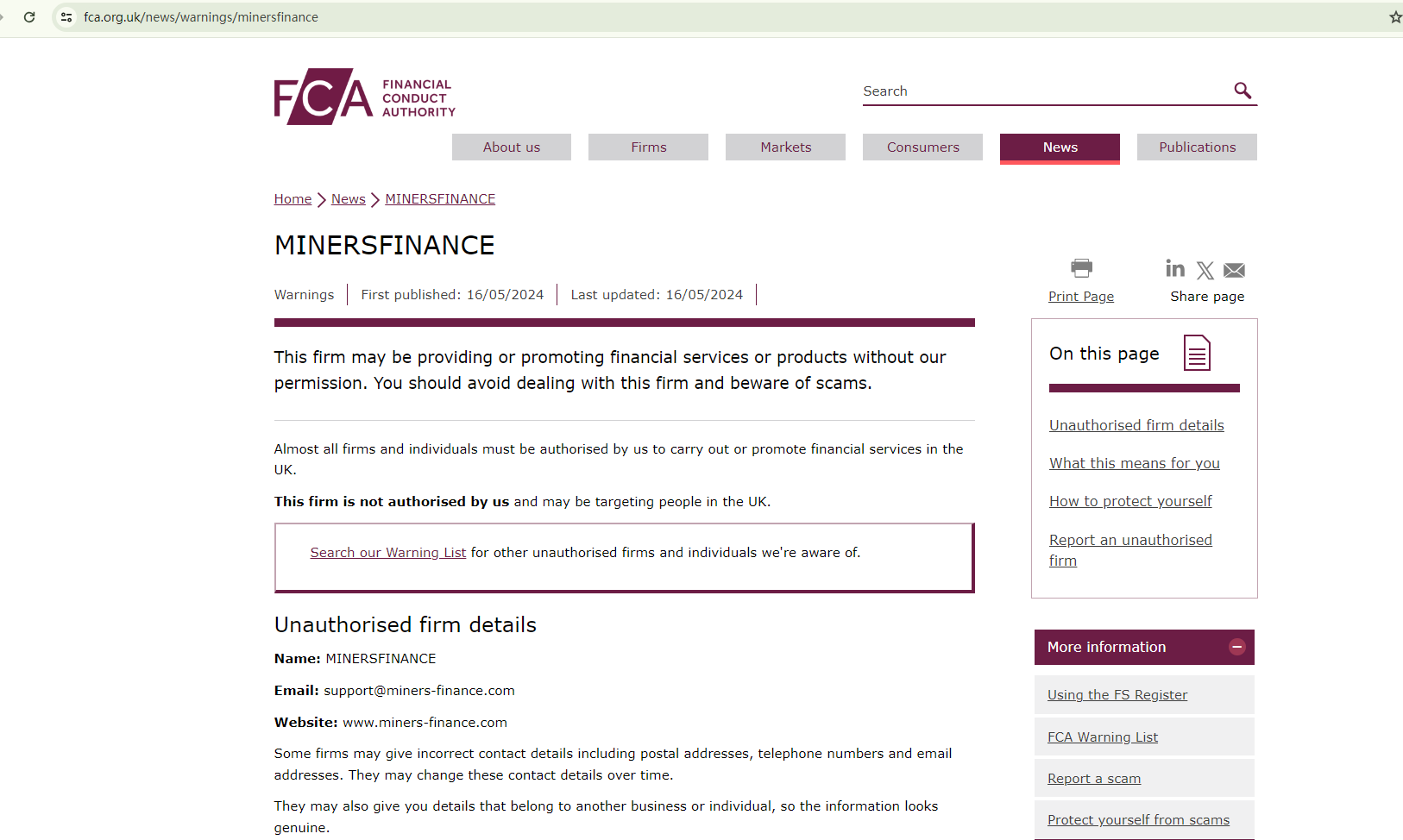 MINERSFINANCE claims to be registered in the UK, but hasn't provided specific address. This lack of transparency is a red flag. The company number 10592814 it alleges is linked to Pesos Ltd in the register of the Companies House (CH), an entity, however, that has been dissolved. In addition, there isn't evidence of potential association between MINERSFINANCE and Pesos Ltd.What's more, the Financial Conduct Authority (FCA) has issued a warning against MINERSFINANCE, underscoring its unauthorized status in the UK. This strongly suggests that the broker is operating outside the regulatory framework enforced by the FCA.In essence, MINERSFINANCE is not regulated by any governing body. Entrusting it with investors' funds is highly risky, as there are no legal protections in place to safeguard the funds.MINERSFINANCE appears to be a scam.