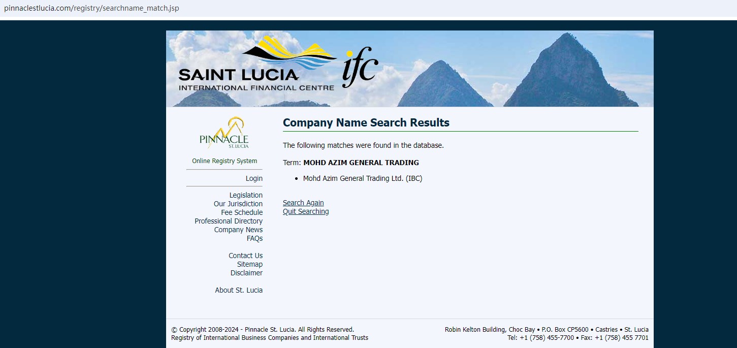 Upon investigation, we found that Mohd Azim General Trading Ltd is registered with the International Financial Centre (IFC) in Saint Lucia, an International Business Companies Registry that doesn't license forex trading brokerage activities.