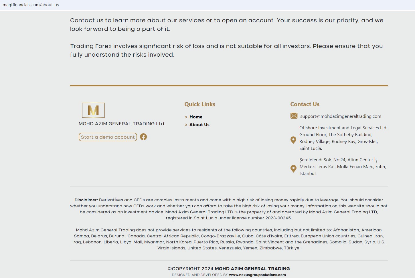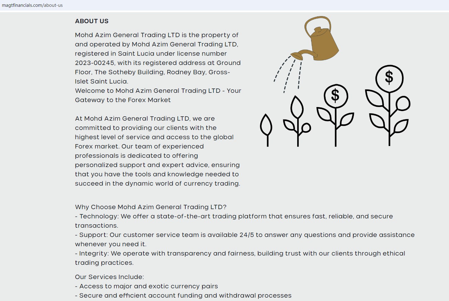 Mohd Azim General Trading LTD claims to be registered in Saint Lucia under license number 2023-00245, which is committed to providing clients with the highest level of service and access to the global Forex market.