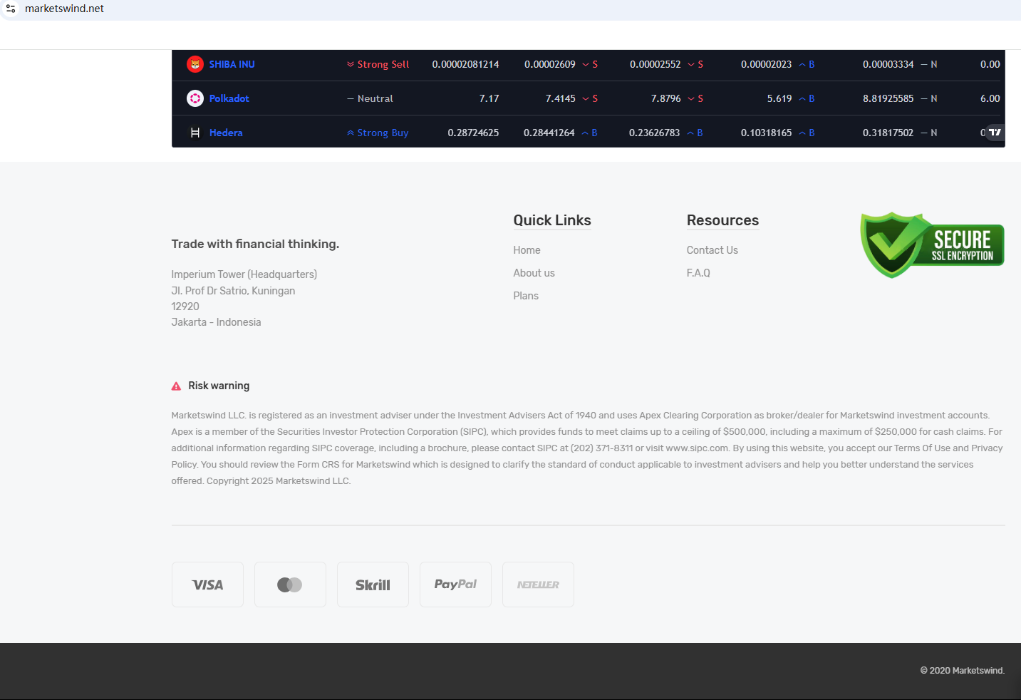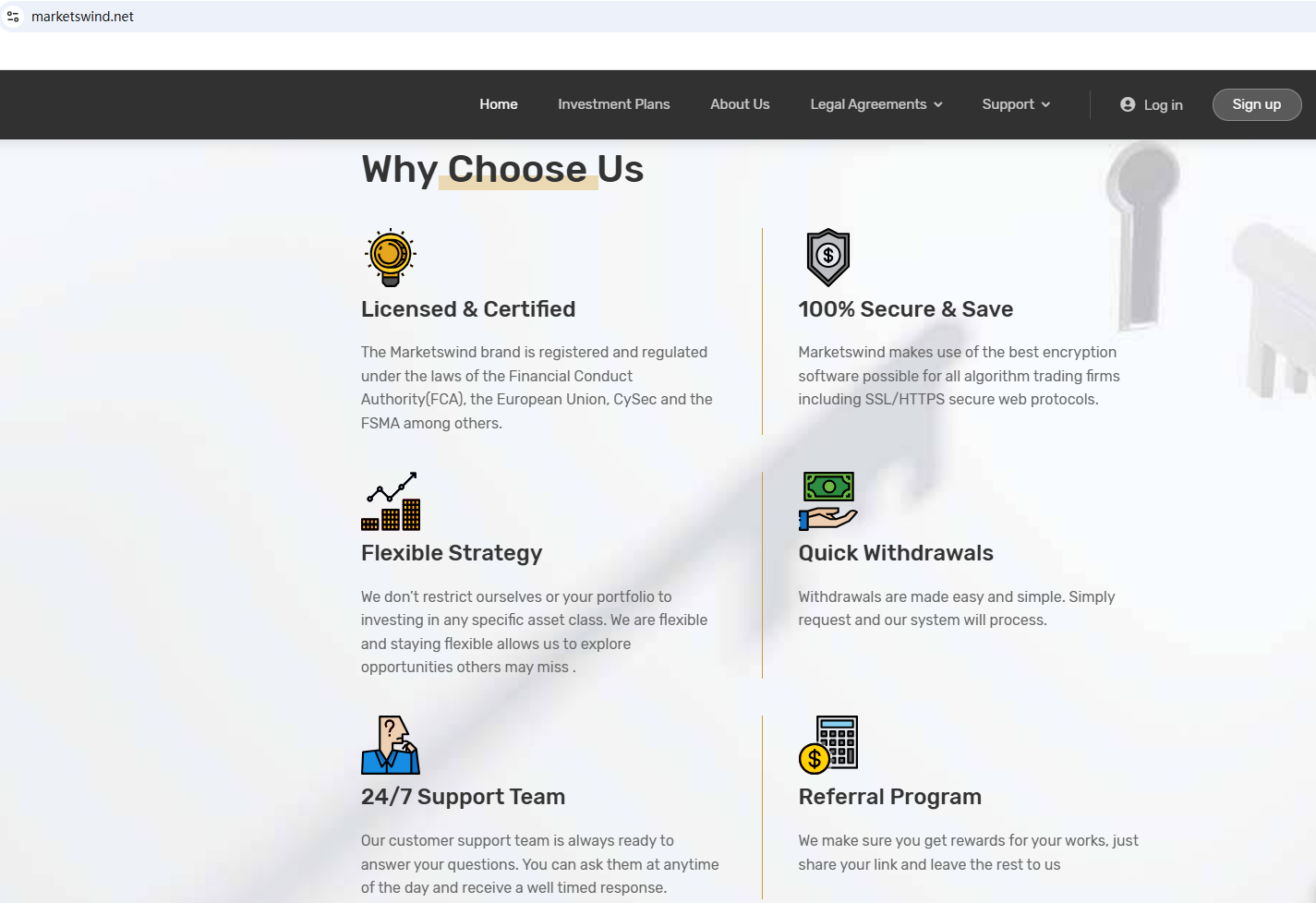In essence, Marketswind is not regulated by any governing body. Entrusting it with investors' funds is highly risky, as there are no legal protections in place to safeguard the funds.