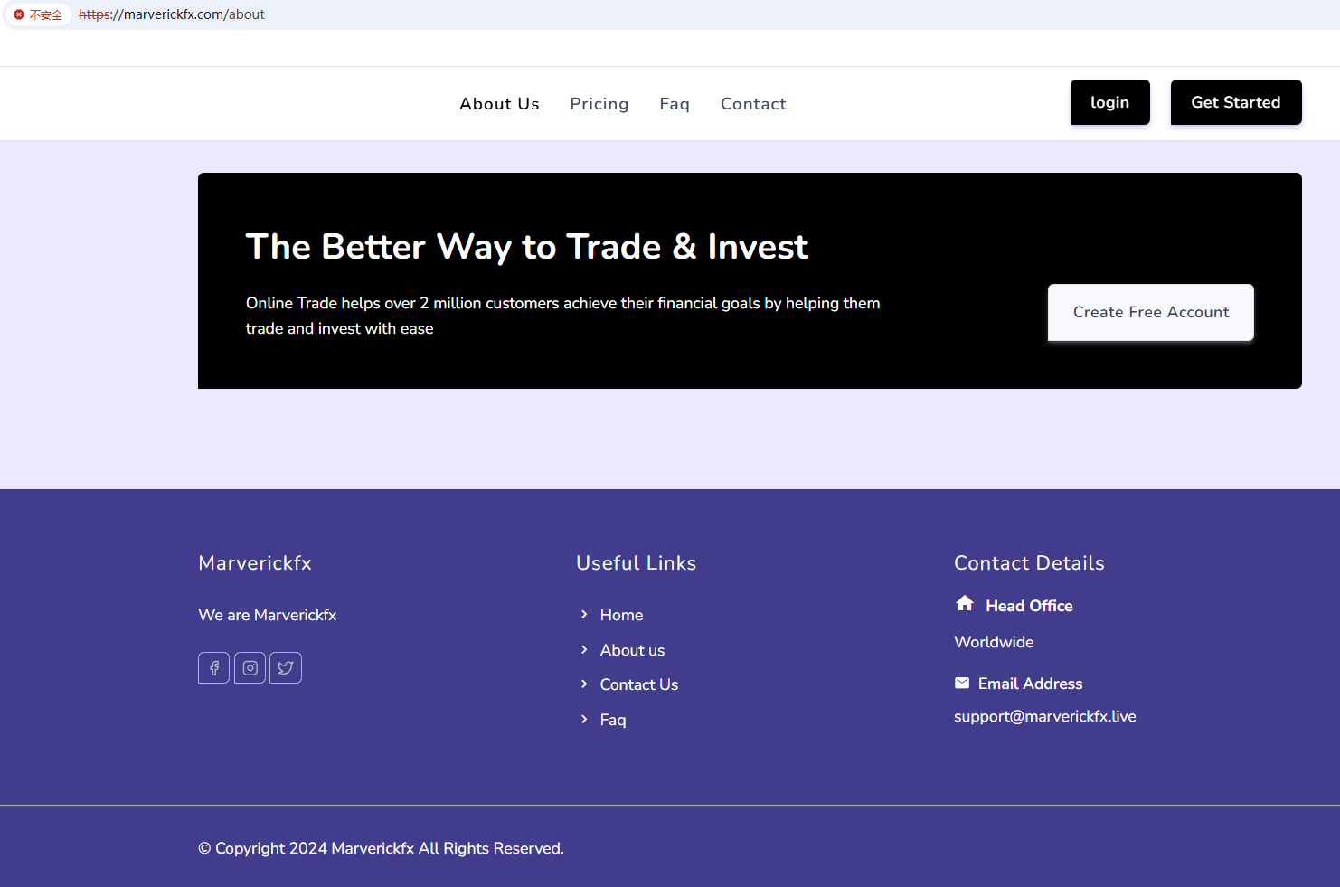 According to its website, it claims to be a reliable trader, but it does not display any valid regulatory information on the website, and even the most basic office address and phone number are not disclosed. This is a very unreliable behavior, and investors are advised to stay away from it.In essence, Marverickfx is not regulated by any governing body. Entrusting it with investors' funds is highly risky, as there are no legal protections in place to safeguard the funds.Marverickfx appears to be a scam.