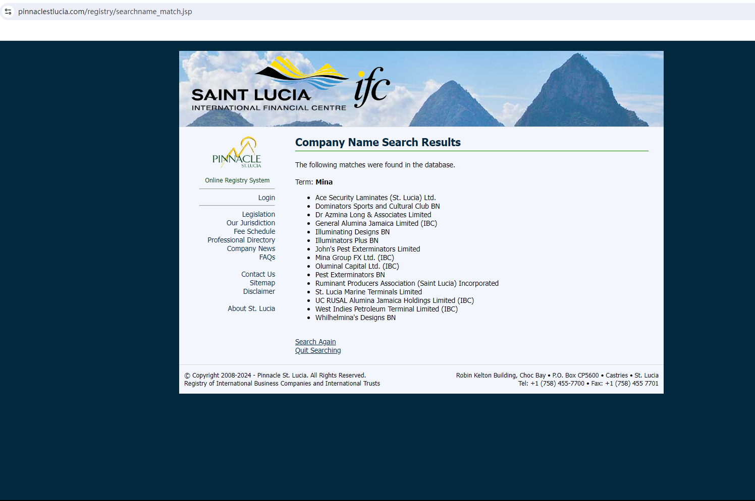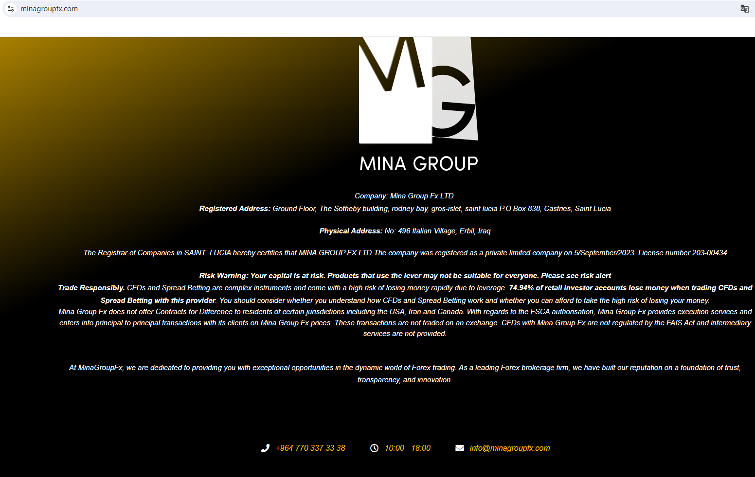Mina Group Fx claims to be registered in St. Lucia, promoting this registration as proof of its legitimacy. However, forex trading activities are not licensed in St. Lucia. Therefore, Mina Group Fx is not regulated at all. Entrusting it with investors' funds is highly risky, as there are no legal protections in place to safeguard the funds.
