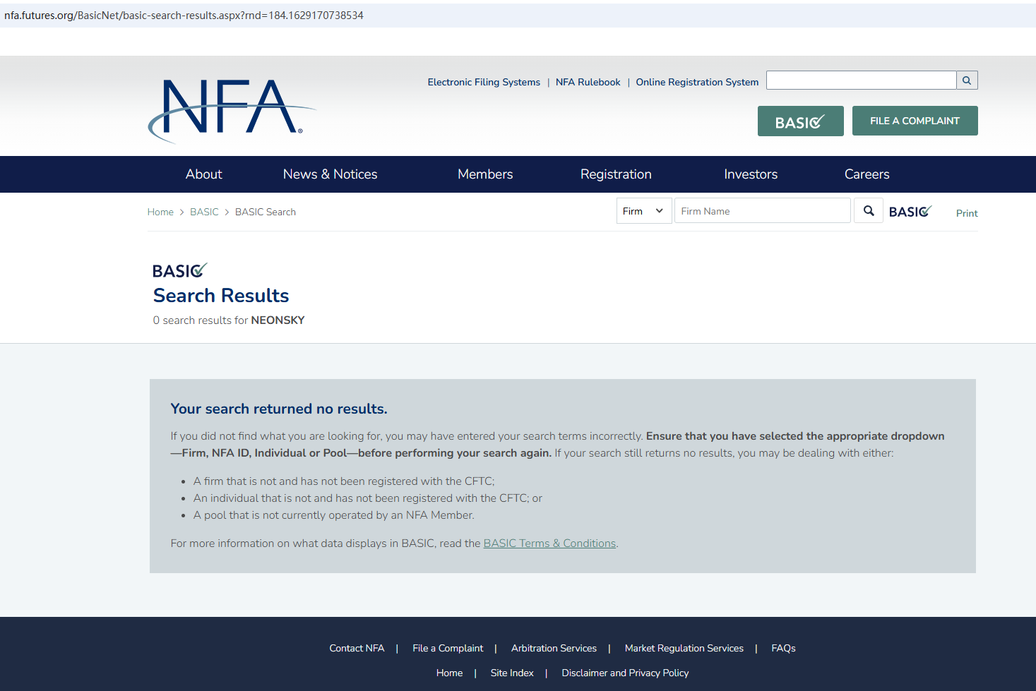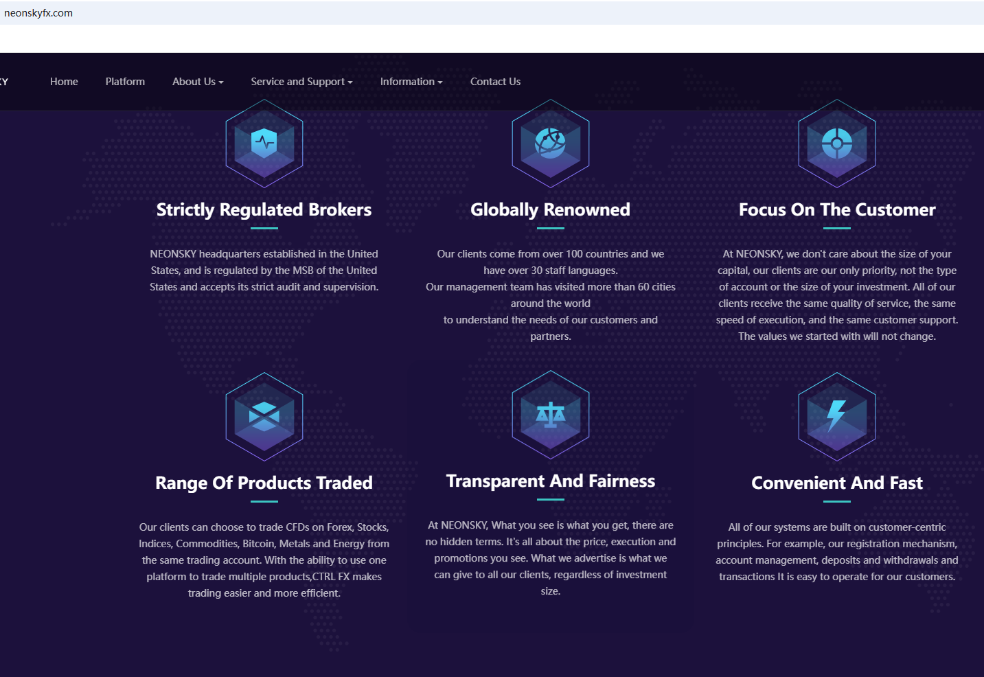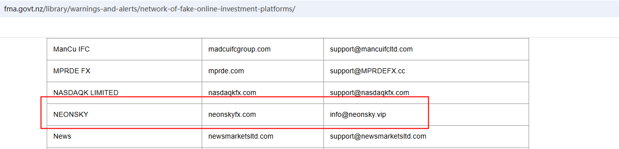 According to its website, it uses a common template for scam websites and has been flagged by Brokersview many times before. It claims to be regulated by Money Services Business (MSB) and registered in the United States. In fact, MSB does not have the right to regulate foreign exchange, and no matching information is found in National Futures Association (NFA). The New Zealand Financial Markets Authority (NZ FMA) has added NEONSKY to its warning list to advise investors to stay away from potential scams. Investors should be informed and stay vigilant.