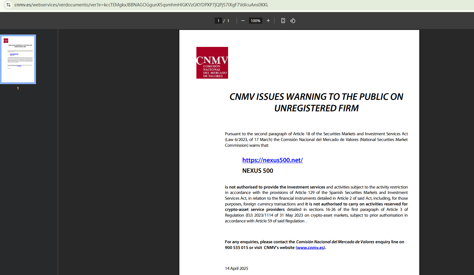 While NEXUS500 claims to be a brokerage firm, it doesn't provide any useful information to prove its authenticity and legitimacy. This lack of transparency indicates substantial risks. In addition, the Comisión Nacional del Mercado de Valores (CNMV) has added NEXUS500 to its warning list for providing investment services without authorization.