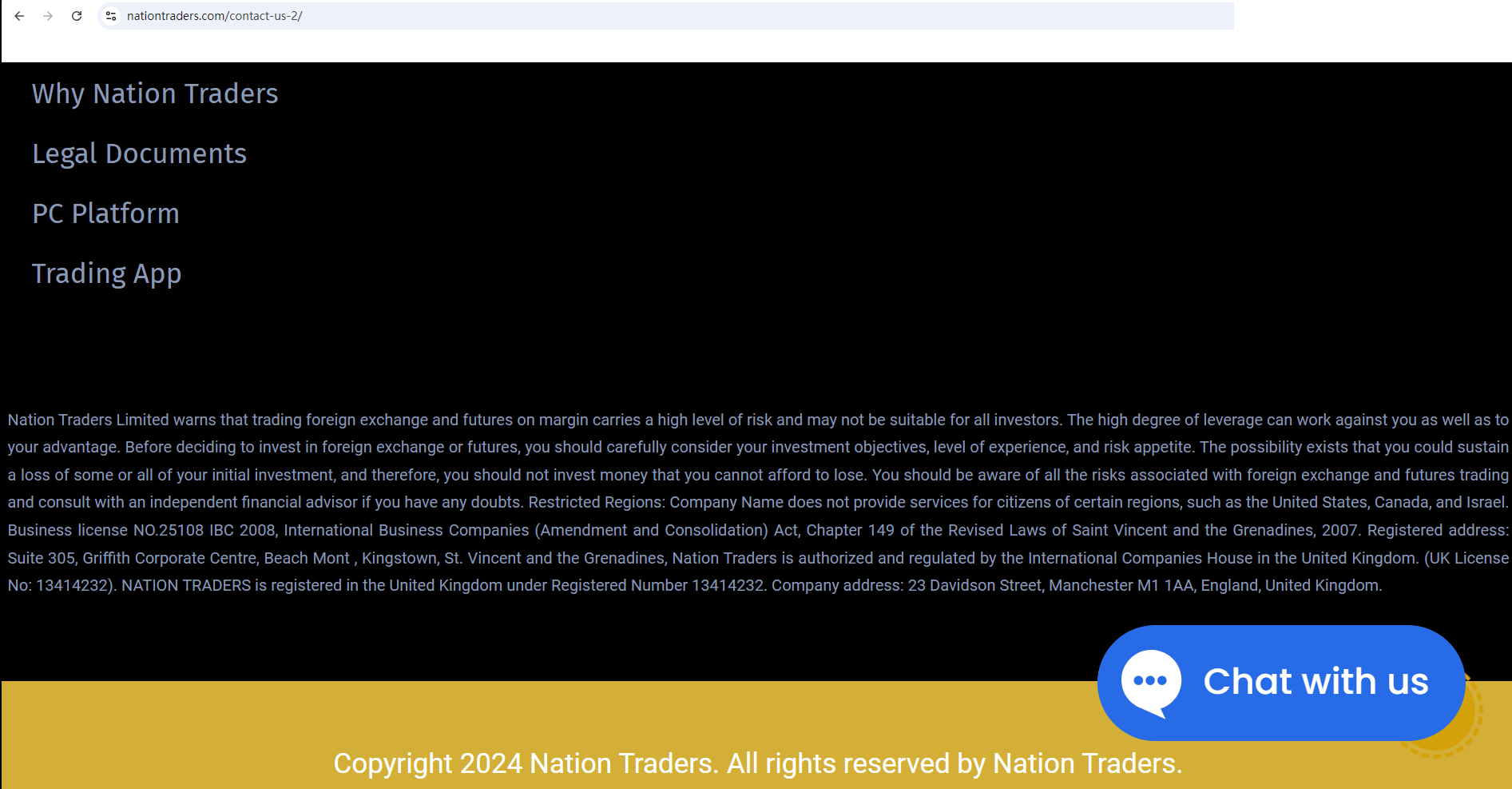 According to its website, it claims to be registered in St. Vincent and the United Kingdom. Upon investigation, no matching information was found in the Financial Services Authority (FSA) (SVG FSA). As we all know, if you want to exercise foreign exchange rights in the UK, you must obtain authorization from the Financial Conduct Authority (FCA). Similarly, we did not find matching information in the FCA.The truth is that Nation Traders is not regulated by any regulators. Letting it hold or control investors money is unsafe, and the money can not be protected by any laws.Nation Traders is a scam.