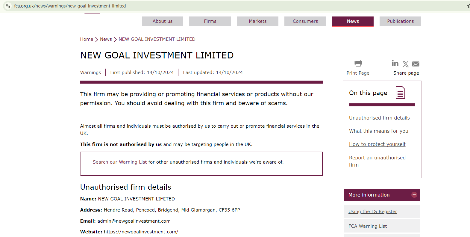 New Goal Investment, registered in April 2024, is a relatively new online platform. Upon investigation, we found that the site withholds crucial company information, leaving investors uninformed and unable to hold the company accountable for any issues. This lack of transparency raises concerns about the company's reliability and potential to disappear without a trace. Additionally, the Financial Conduct Authority (FCA) has issued a warning about New Goal Investment due to its unlicensed status.