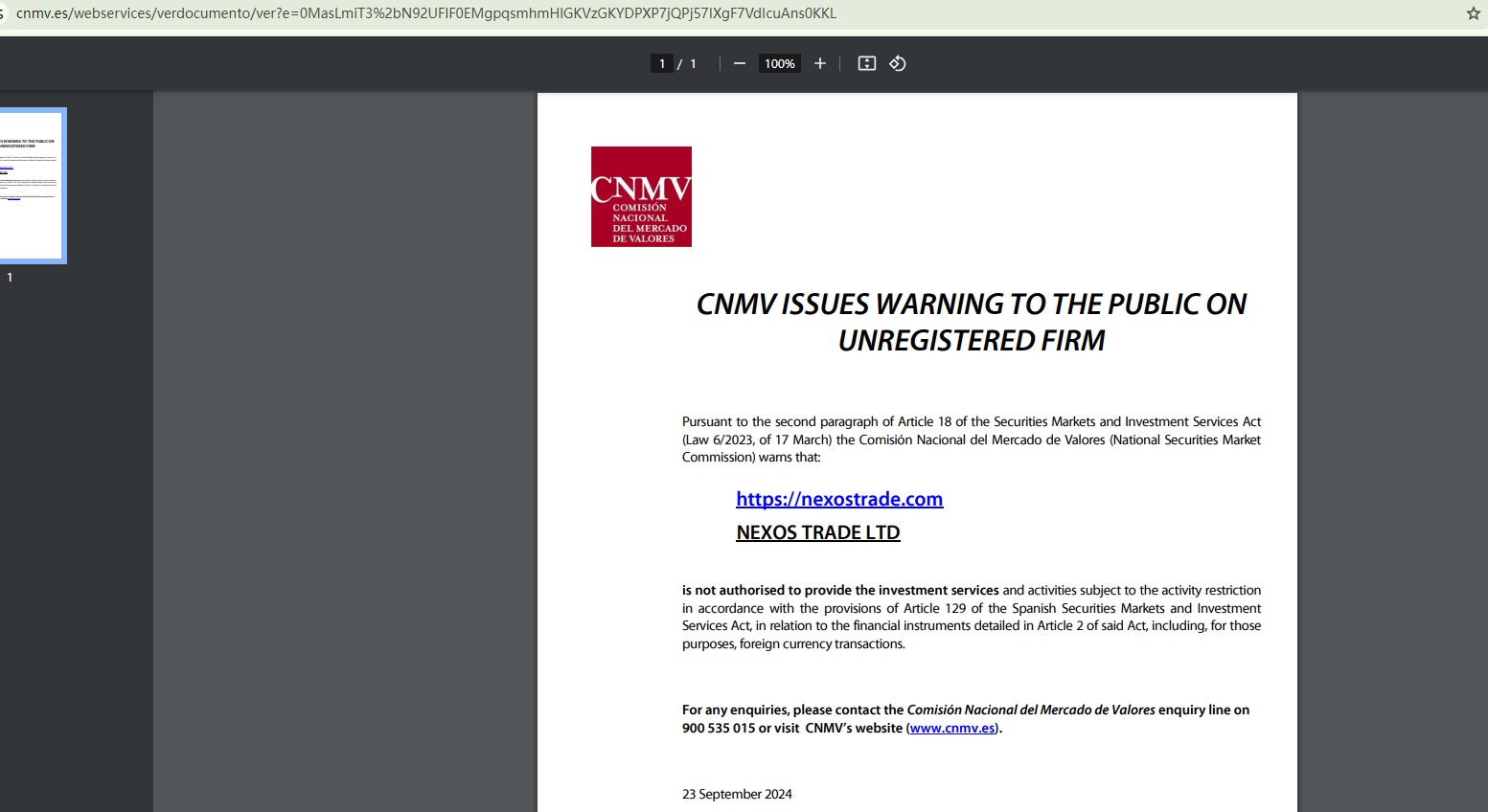In addition, the Comisión Nacional del Mercado de Valores (CNMV) has added NexosTrade to its warning list for providing investment services without authorization.