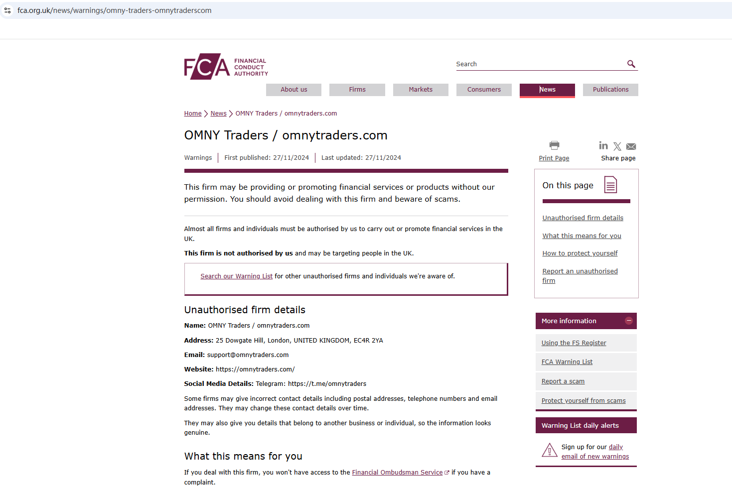 According to its website, it claims to be regulated by Financial Conduct Authority (FCA). However, we found that the Financial Conduct Authority (FCA) issued a warning against OMNY Traders, believing this company might be providing financial services or products without proper authorization in the UK.
