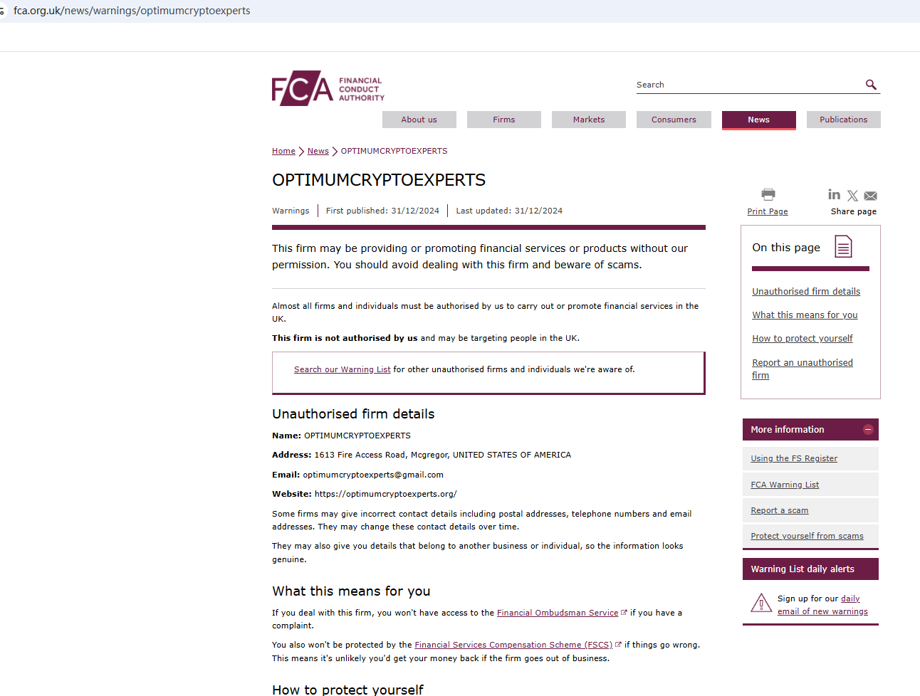 Moreover, the Financial Conduct Authority (FCA) issued a warning against OPTIMUMCRYPTOEXPERTS, believing this company might be providing financial services or products without proper authorization in the UK.