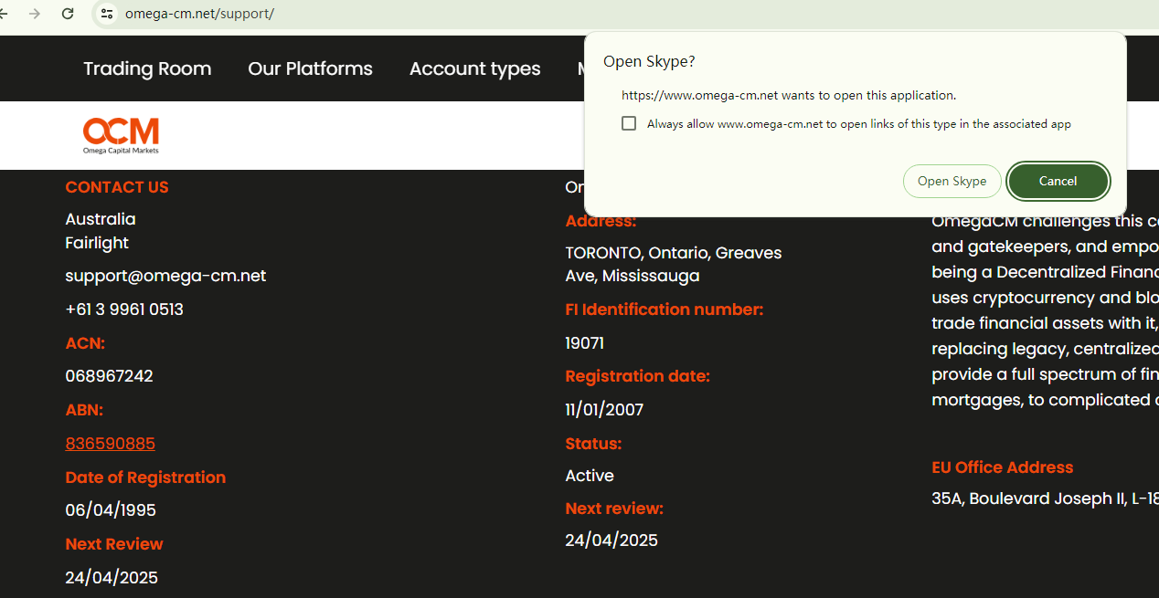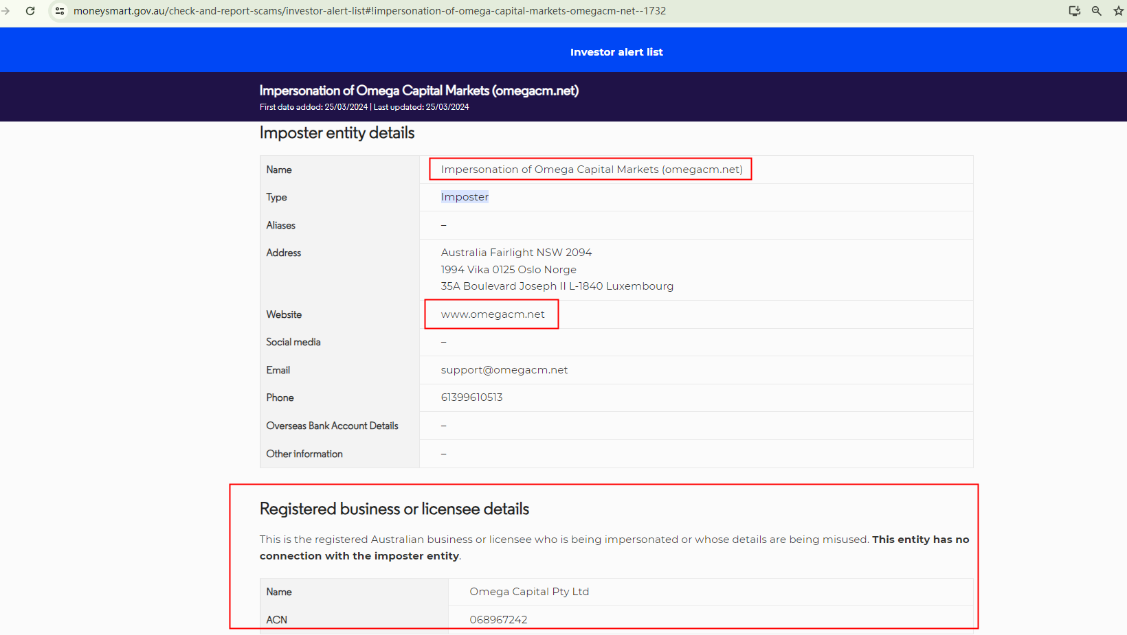It raises suspicions when links labeled with registration numbers direct to Skype instead of the specific page of the registry. Furthermore, this brand operates under two domains, one of which is inaccessible, and the other was newly registered in March 2024. These facts cast doubt on the credibility of Omega Capital Markets.Omega Capital Markets displays registration information at the bottom of its homepage, claiming to be registered with relevant financial regulators in both Australia and Canada. However, the Australian Securities and Investments Commission (ASIC) has already issued a warning about Omega Capital Markets, identifying it as an imposter that misuses the information of the registered entity, OMEGA CAPITAL PTY LTD. As for its Canadian registration, there are no corresponding records from the Investment Industry Regulatory Organization of Canada (IIROC) to suggest its legitimacy and authenticity.Another compelling evidence of its illegitimacy comes from the Financial Services and Markets Authority (FSMA), which has added Omega Capital Markets to its warning list as a fraudulent platform and advised investors to steer clear of it.In essence, Omega Capital Markets is not regulated by any governing body. Entrusting it with investors' funds is highly risky, as there are no legal protections in place to safeguard the funds.Omega Capital Markets appears to be a scam.