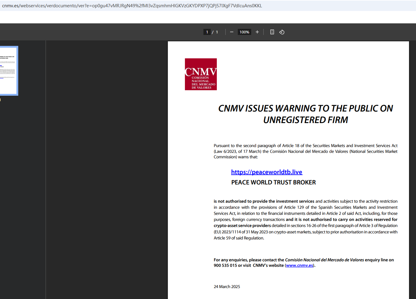 Moreover, we found that the Financial Conduct Authority (FCA) issued a warning against PEACE WORLD TRUST BROKER, believing this company might be providing financial services or products without proper authorization in the UK.