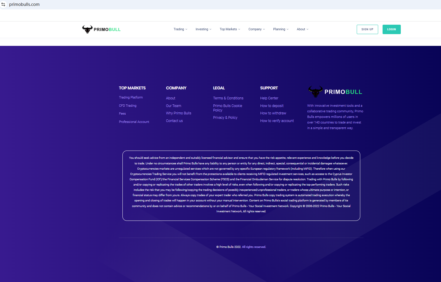 In essence, PRIMOBULL is not regulated by any governing body. Entrusting it with investors' funds is highly risky, as there are no legal protections in place to safeguard the funds.
