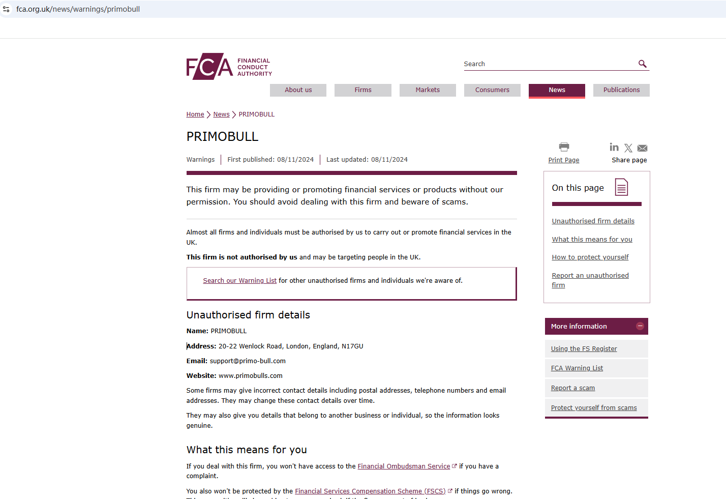 According to its website, it claims to be established in 2007 and is located in the UK. Upon investigation, we found that its domain name was only established in 2023, and the Financial Conduct Authority (FCA) issued a warning against PRIMOBULL, believing this company might be providing financial services or products without proper authorization in the UK. In essence, PRIMOBULL is not regulated by any governing body. Entrusting it with investors' funds is highly risky, as there are no legal protections in place to safeguard the funds.PRIMOBULL appears to be a scam.