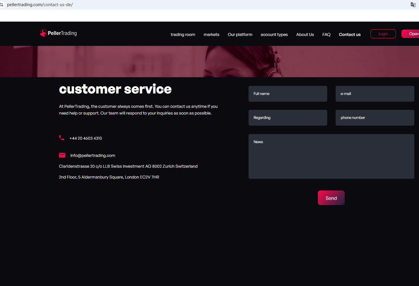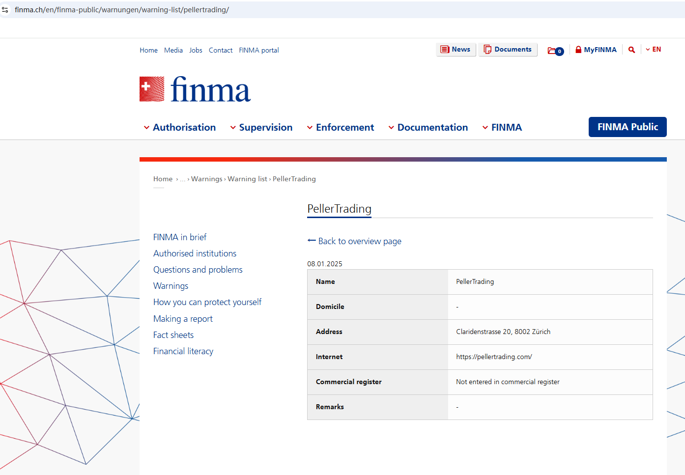 According to its website, it claims to be regulated by Swiss Financial Market Supervisory Authority (FINMA). Upon investigation, we found that the Swiss Financial Market Supervisory Authority (FINMA) issued a warning against PellerTrading, stating that this broker is not entered in its commercial register.