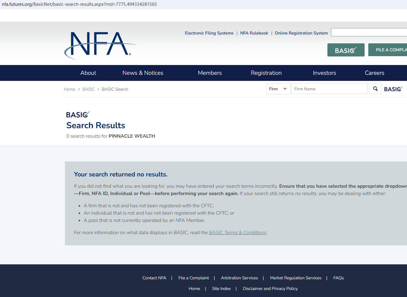 In essence, Pinnacle Wealth is not regulated by any governing body. Entrusting this broker with investors' funds is highly risky, as there are no legal protections in place to safeguard the funds. Pinnacle Wealth is unequivocally a scam.