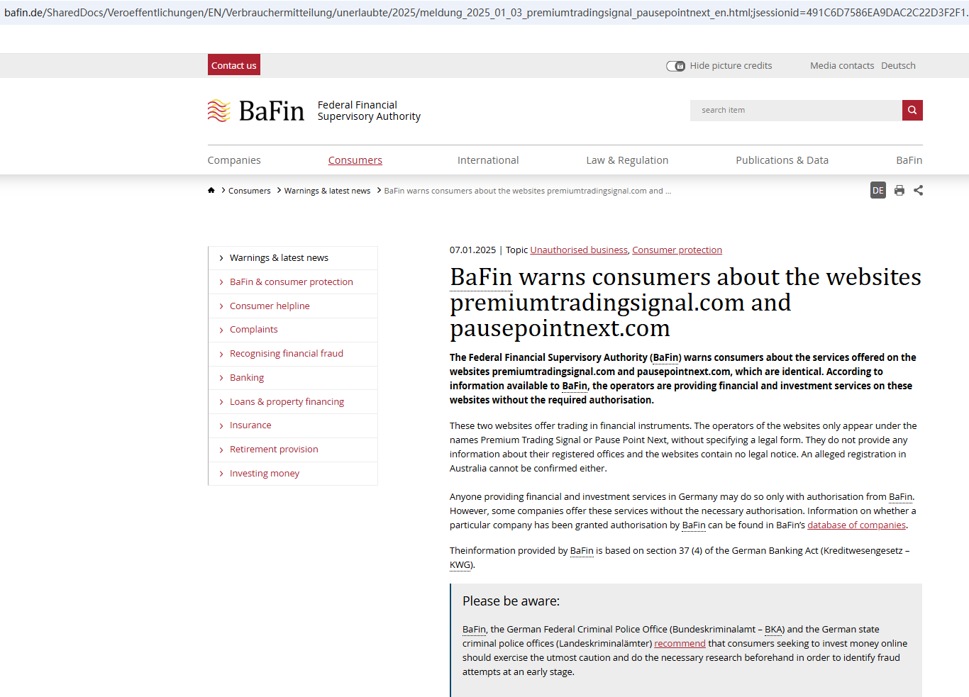 In addition, we found that the Federal Financial Supervisory Authority (BaFin) warned consumers about the company Premium Trading Signal and the services it was offering. BaFin has information that the company is offering banking business and/or financial services on its website without the required authorisation. The company is not supervised by BaFin.