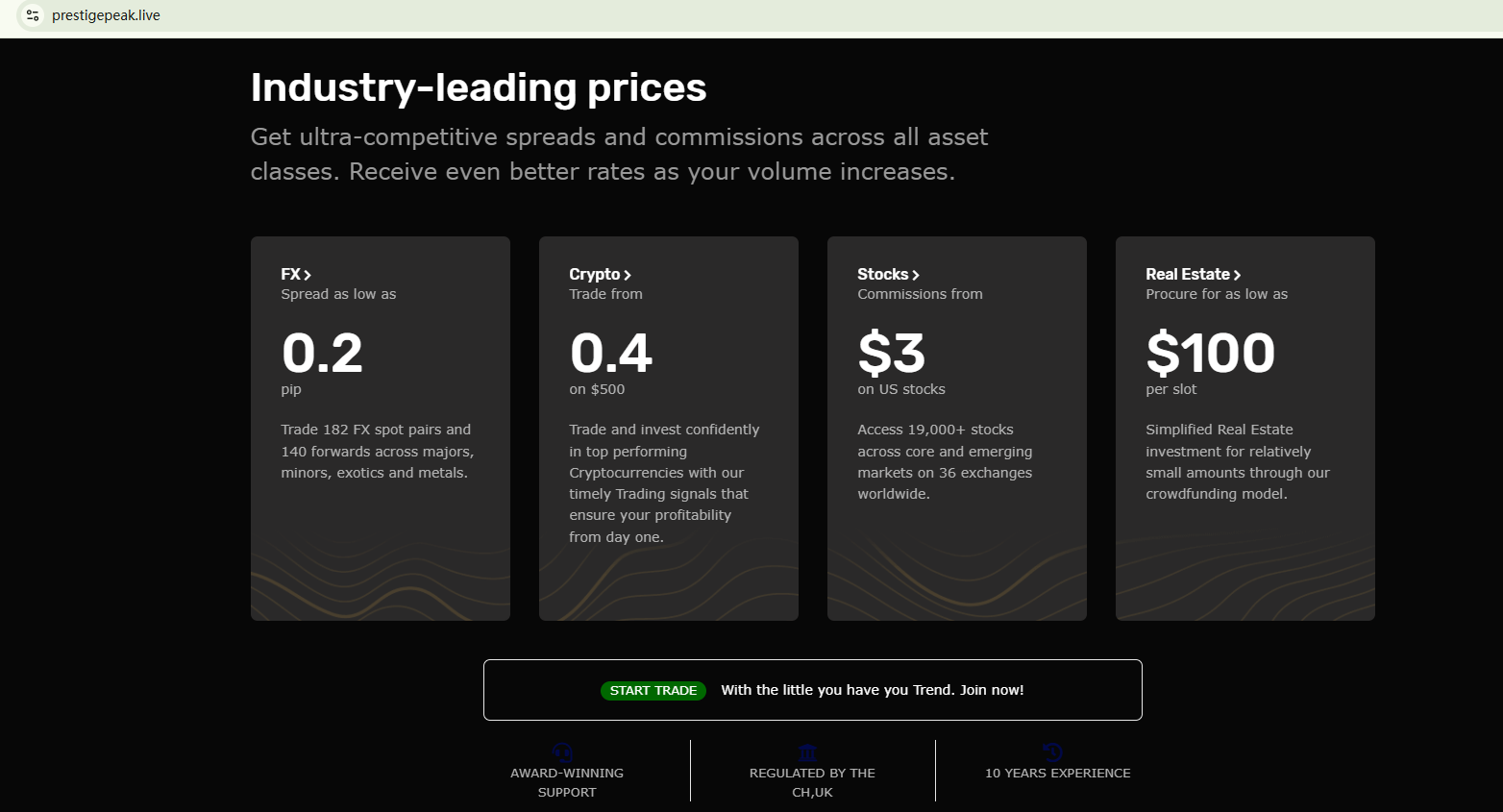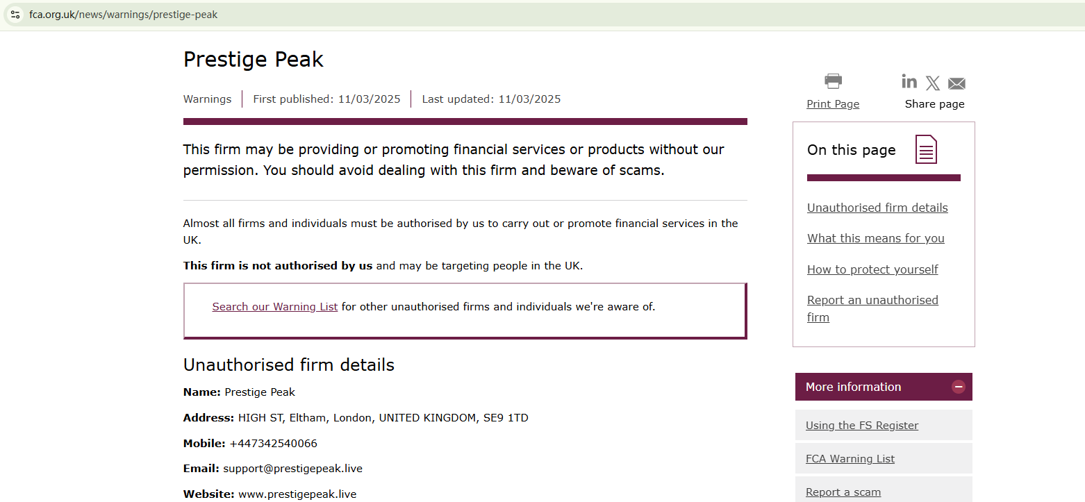 Prestige Peak falsely claims to be regulated in the UK. The British major financial regulator, the Financial Conduct Authority (FCA) has issued a warning about Prestige Peak, advising investors to stay away from this unauthorized financial firm.