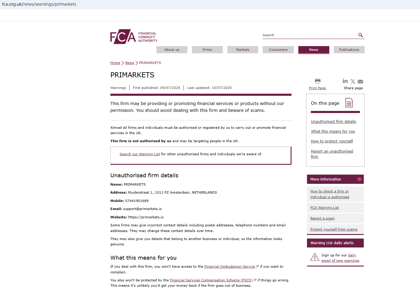According to its website, it is located in the Netherlands. Upon investigation, no matching information was found in the Netherlands Authority for the Financial Markets (AFM). It also claimed that the company was established in 2021, but after checking, it was found that its domain name was not created until 2025, which is a suspicious signal.In addition, the Financial Conduct Authority (FCA) issued a warning against Primarkets, believing this company might be providing financial services or products without proper authorization in the UK.