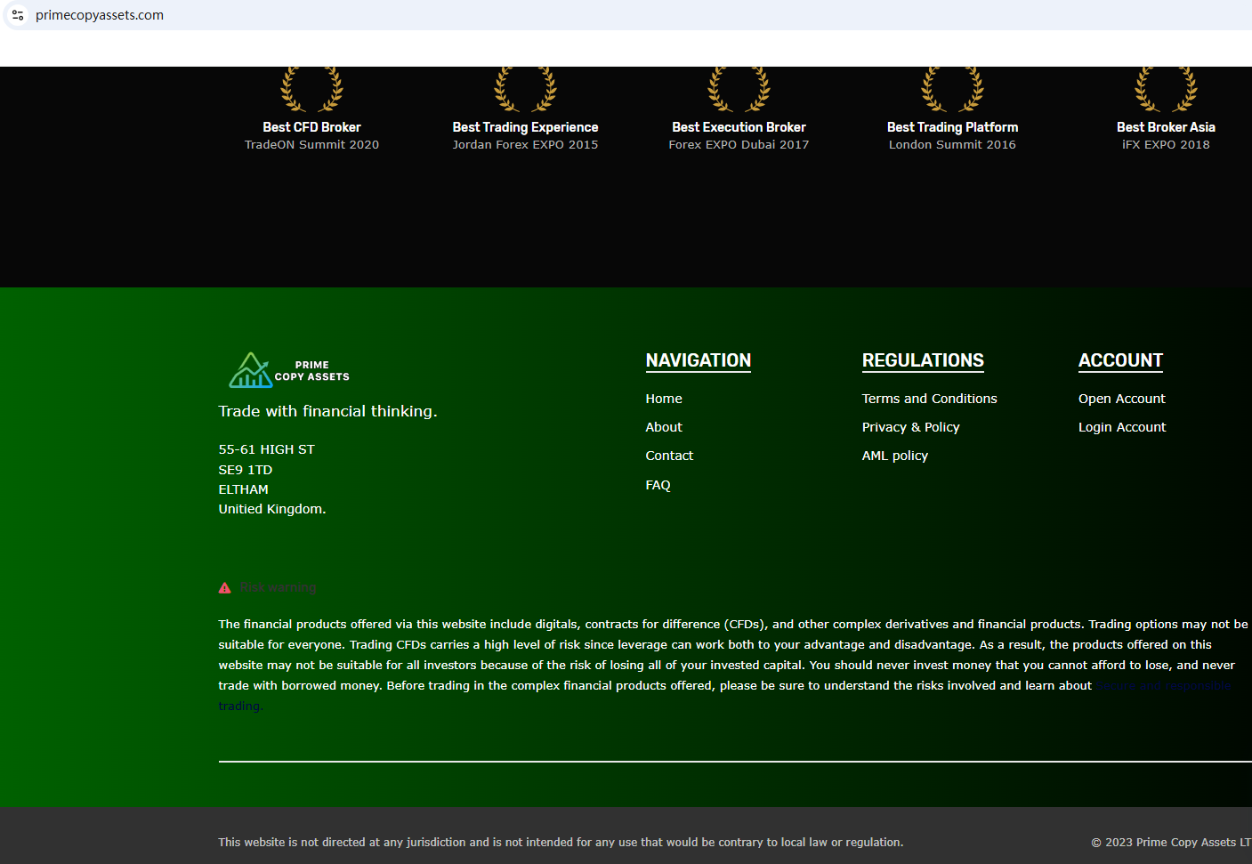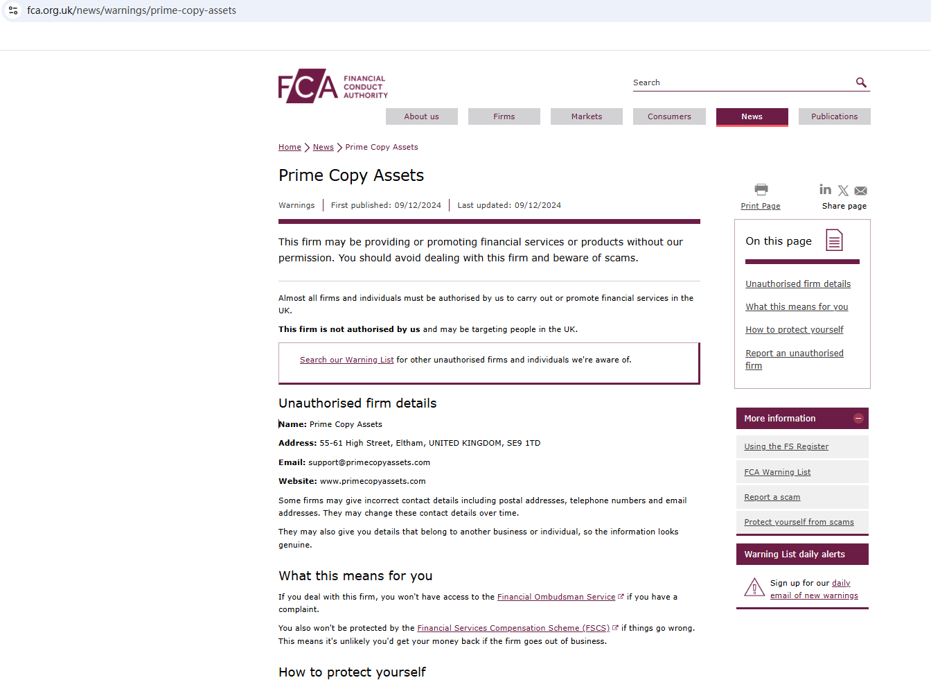 In addition, the Financial Conduct Authority (FCA) red-flagged Prime Copy Assets as an unauthorized firm in the UK.