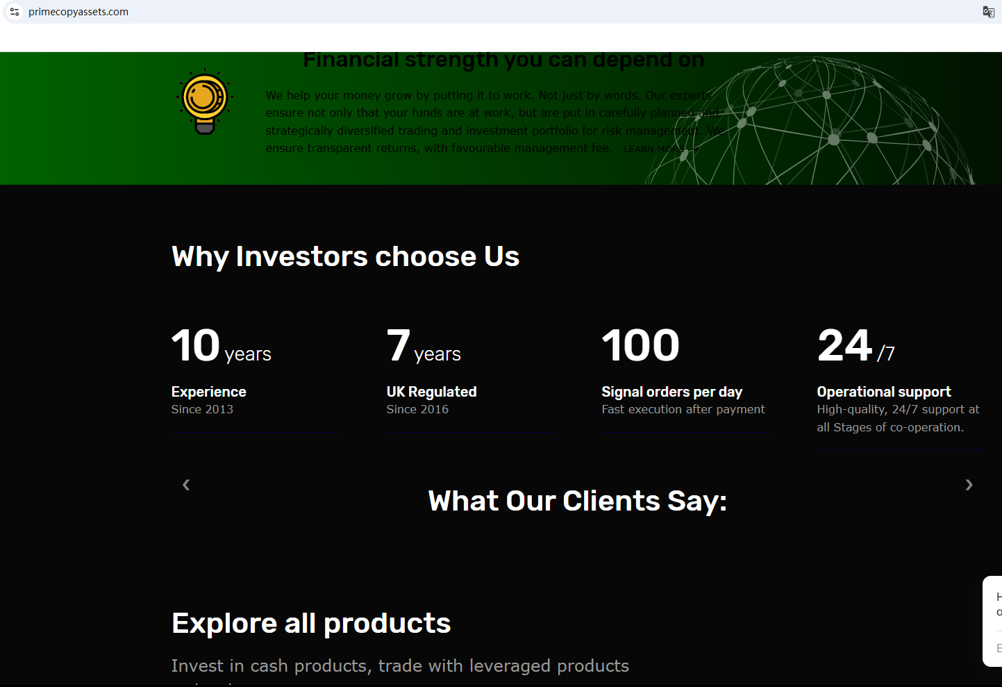 In essence, Prime Copy Assets is not regulated by any governing body. Entrusting it with investors' funds is highly risky, as there are no legal protections in place to safeguard the funds.