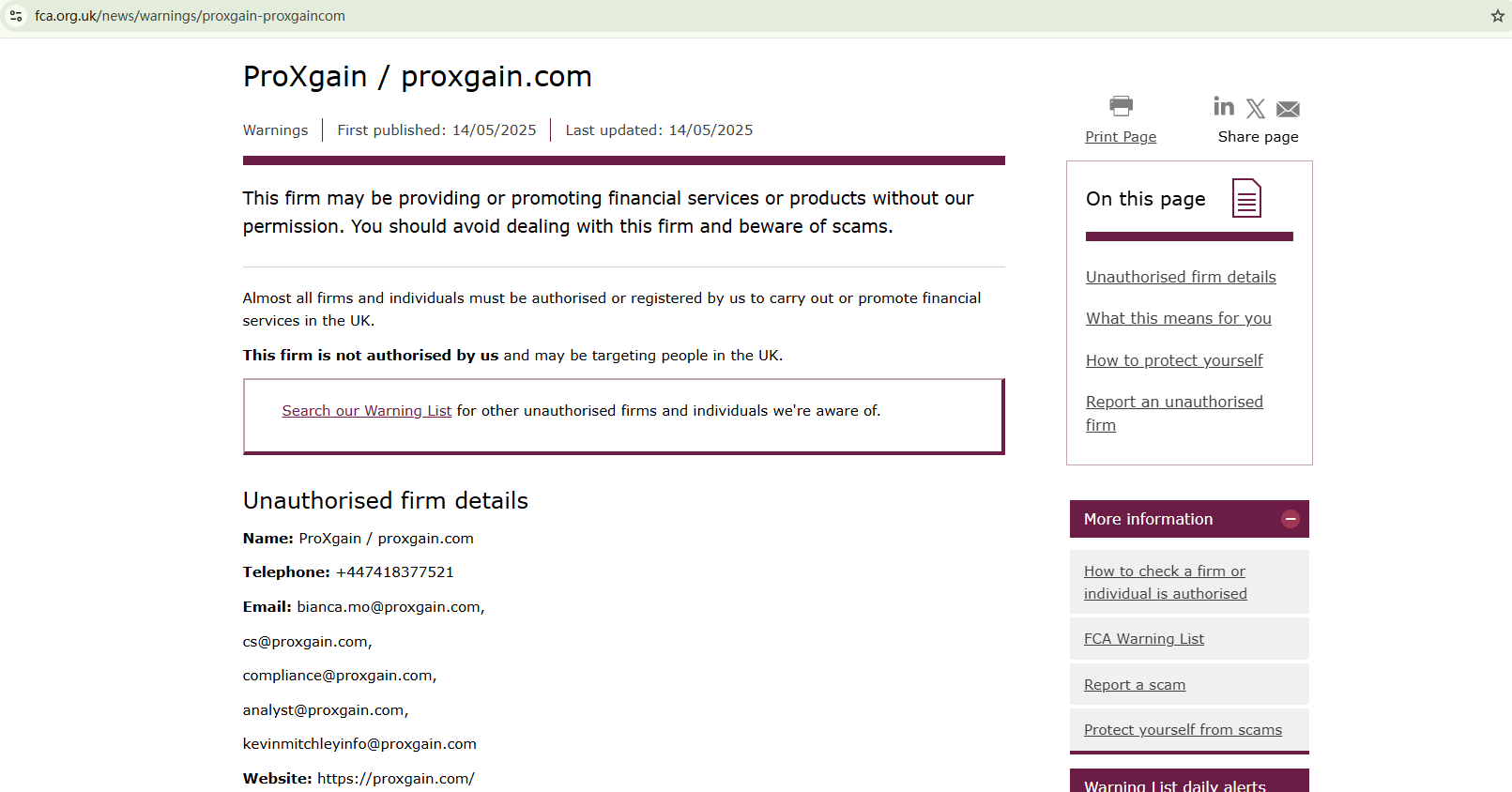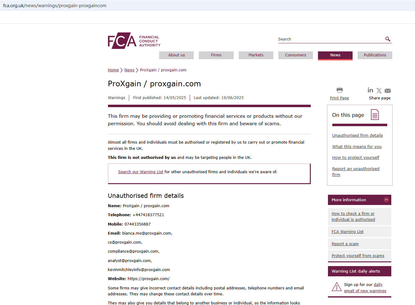 In essence, ProXgain is not regulated by any governing body. Entrusting it with investors' funds is highly risky, as there are no legal protections in place to safeguard the funds. ProXgain appears to be a scam.