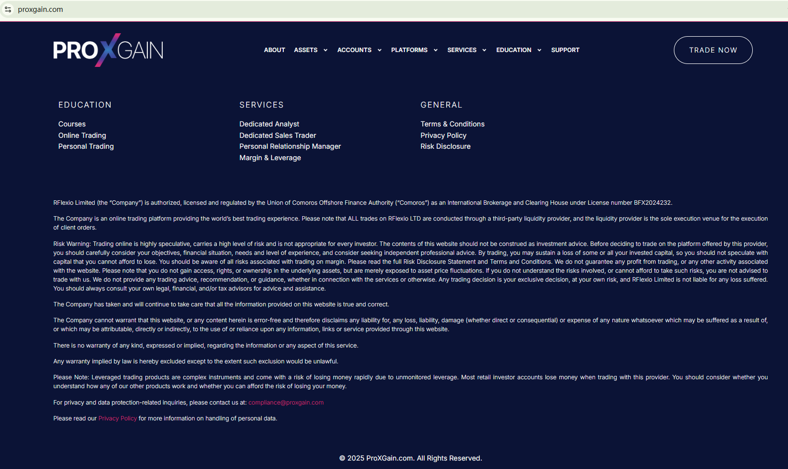 ProXgain claims to be affiliated with a company, RFlexio Limited, which is allegedly registered in Comoros. However, our verification with the Mwali International Services Authority (MISA) hasn't found information supporting the claimed affiliation. It appears that the purported connection merely exists within the website of ProXgain. The Financial Conduct Authority (FCA) has issued a warning against ProXgain for the lack of the required authorization.
