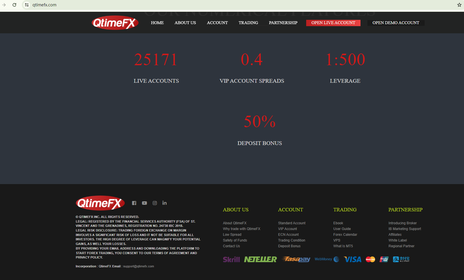 QtimeFX purports to be registered with the Financial Services Authority of St. Vincent and the Grenadines (SVG FSA) under the number 24738 IBC 2018.
