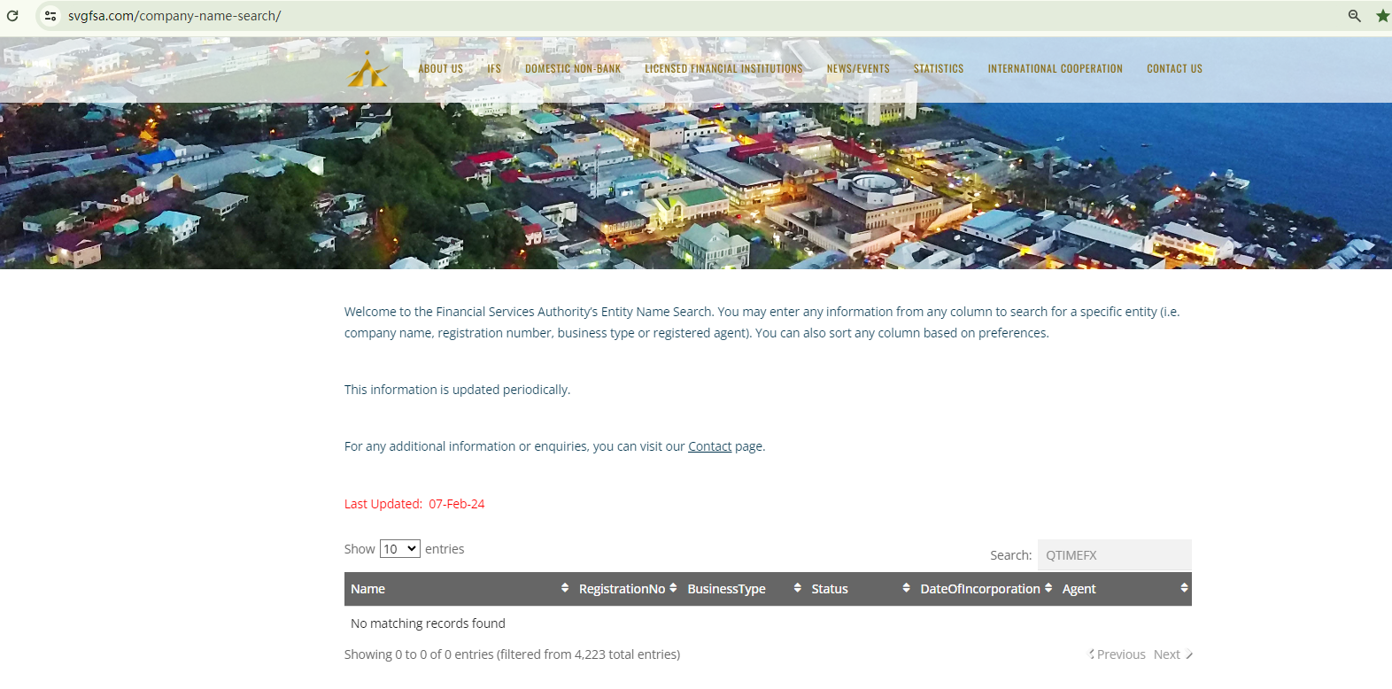 However, neither the company name "QtimeFX" nor the claimed registration number can be located in the SVG FSA register. Even if the registration were valid, the forex broker would still be unlicensed, as the SVG FSA does not issue licenses or supervise forex trading brokerage activities.