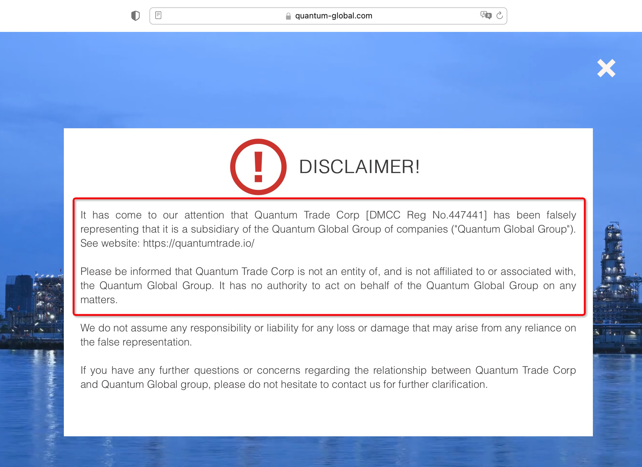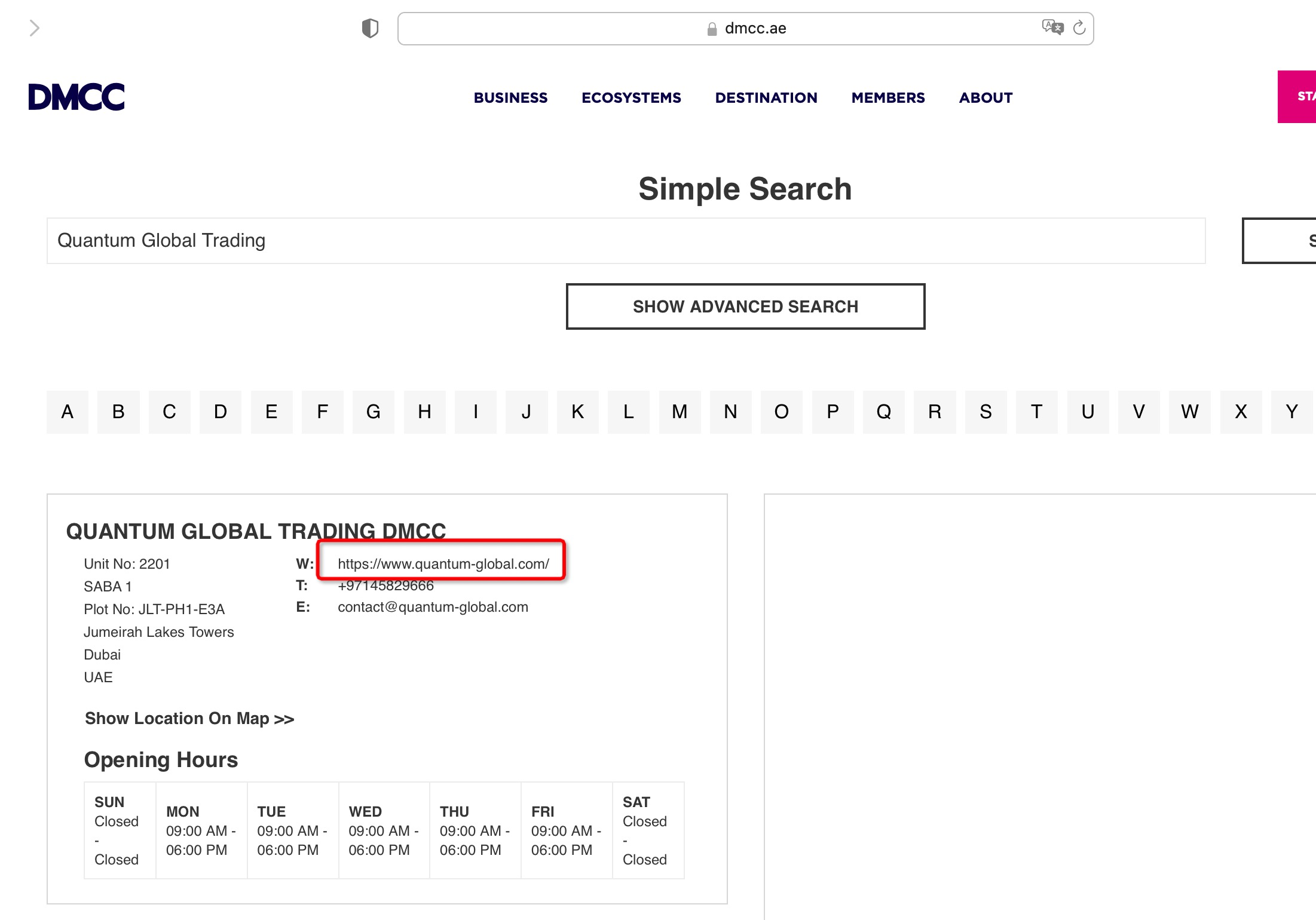 We searched the DMCC for Quantum Global Trading and found a matching result, but the registered website was https://www.quantum-global.com. The licensed website has issued a disclaimer, stating that "Quantum Trade Corp [DMCC Reg No.447441] has been falsely representing that it is a subsidiary of the Quantum Global Group of companies ("Quantum Global Group"). See website: https://quantumtrade.io/. Please be informed that Quantum Trade Corp is not an entity of, and is not affiliated to or associated with, the Quantum Global Group. It has no authority to act on behalf of the Quantum Global Group on any matters."