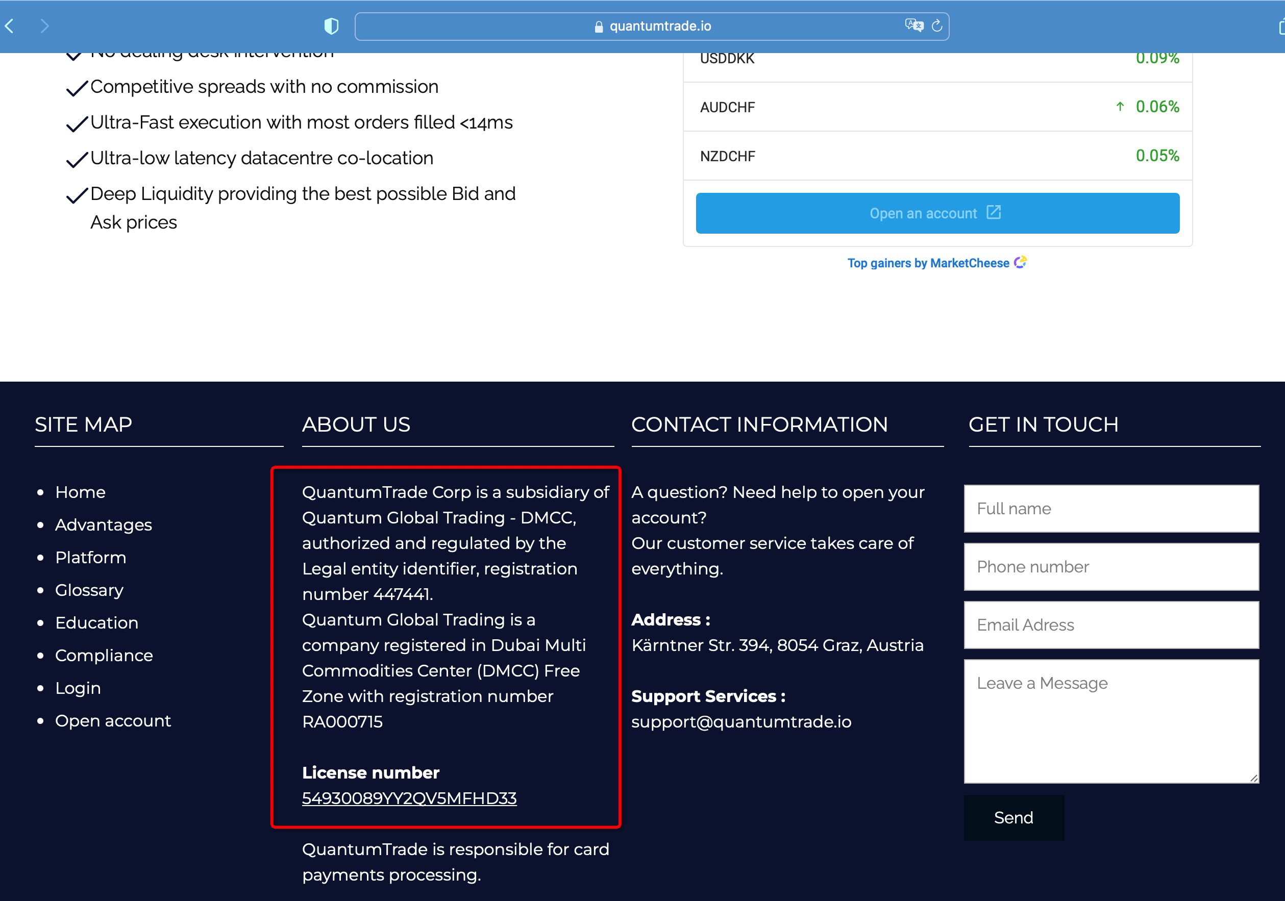 QuantumTrade Corp claims to be a subsidiary of Quantum Global Trading, which is regulated by the Dubai Multi Commodities Center (DMCC).