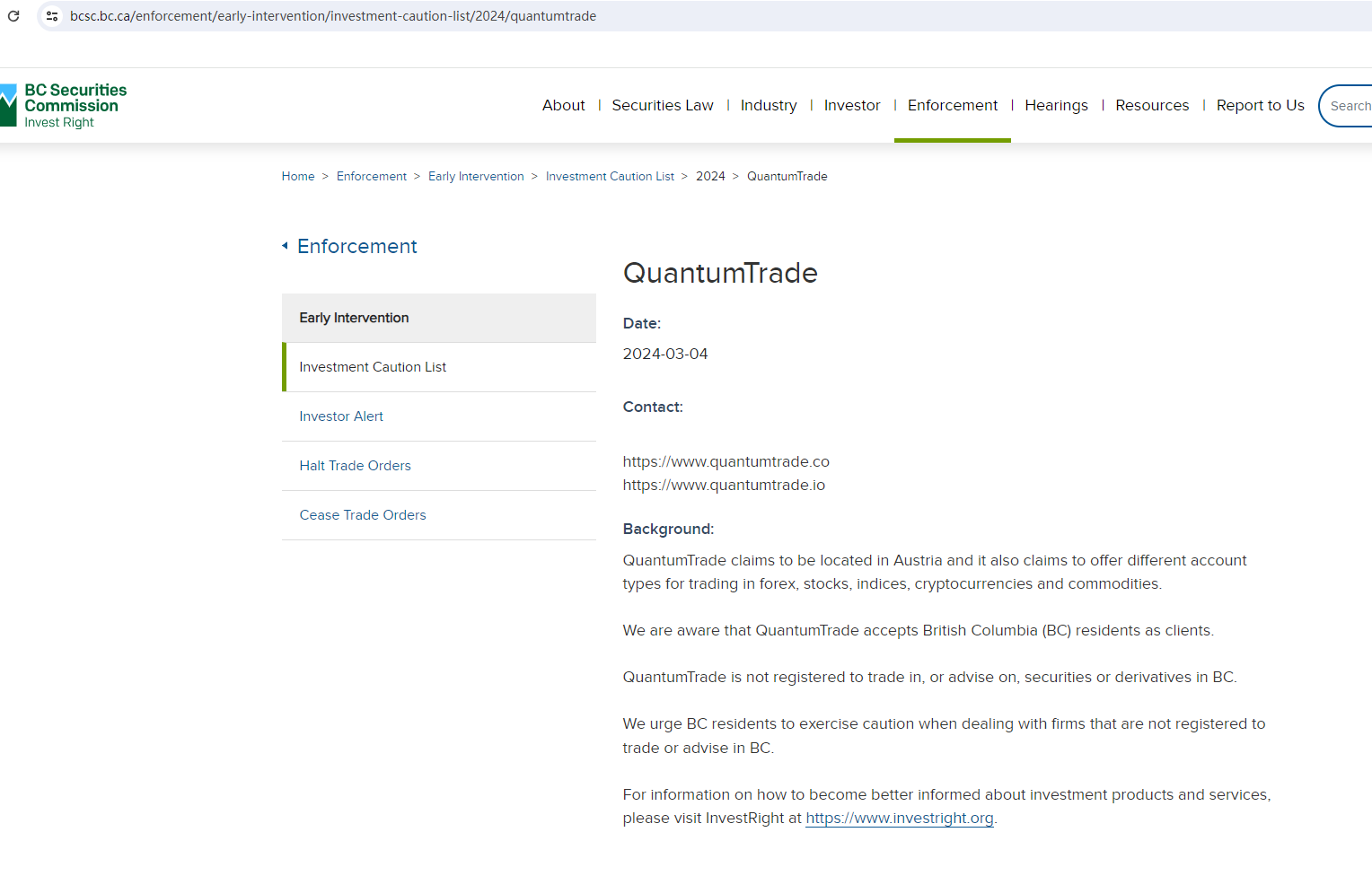 On 4 March 2024, the British Columbia Securities Commission (BCSC) issued a warning that QuantumTrade was providing financial services or products without authorisation. You may visit: https://www.bcsc.bc.ca/enforcement/early-intervention/investment-caution-list/2024/quantumtrade