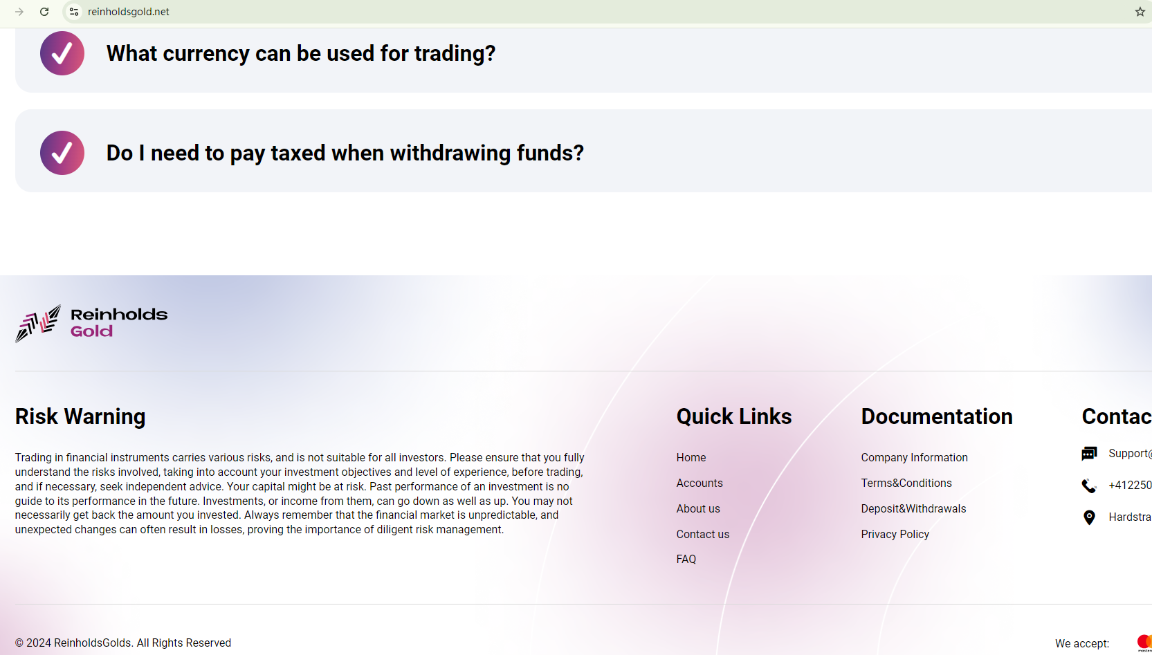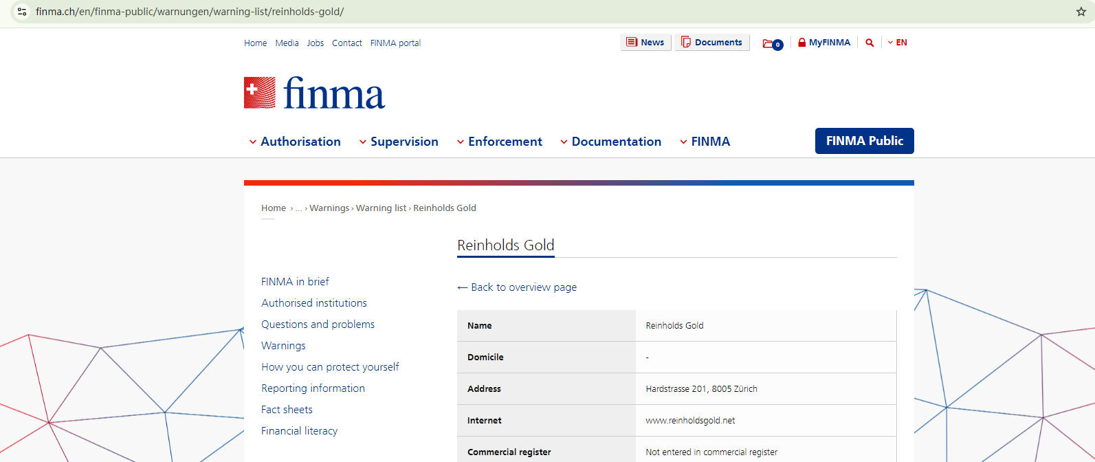 Unlike regulated brokers that display licensing details in the website footer, Reinholds Gold fails to do so. This lack of regulatory information is a red flag. While the broker claims to be located in Switzerland, the Swiss Financial Market Supervisory Authority (FINMA) has issued a warning against Reinholds Gold, stating that this broker is not entered in its commercial register.