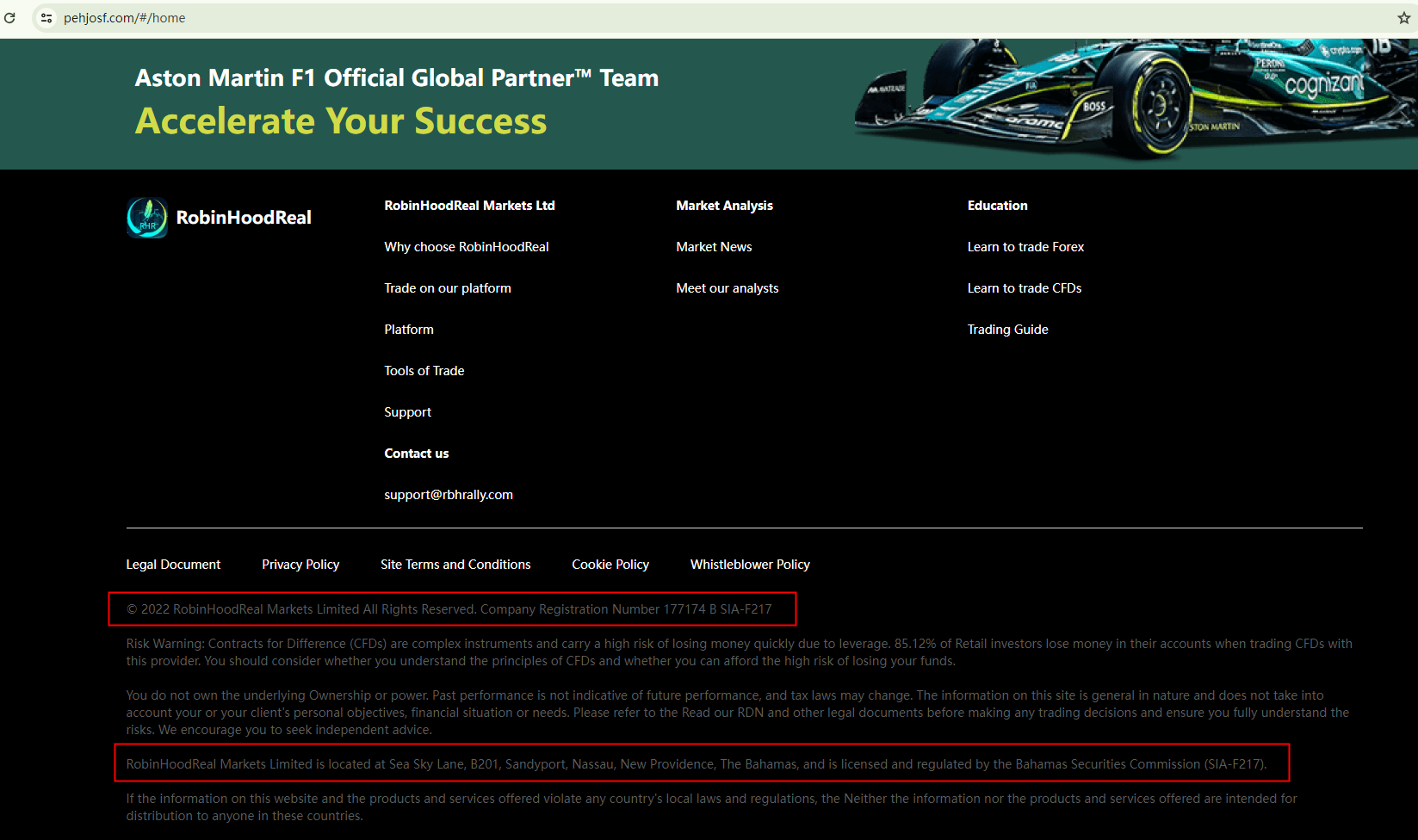 Despite its attempts to build a reputation through exaggerated language, RobinHoodReal is an unregulated broker. BrokersView has noticed that RobinHoodReal shares the same registration information, regulatory statements, and company profile with the suspicious broker, BMVSG. This suggests that RobinHoodReal is likely fraudulent as well.The most compelling evidence comes when the Securities Commission of the Bahamas (SCB) adds RobinHoodReal to its warning list, refuting the broker's false claims of being regulated by them.In essence, RobinHoodReal is not regulated by any governing body. Entrusting it with investors' funds is highly risky, as there are no legal protections in place to safeguard the funds.RobinHoodReal appears to be a scam.