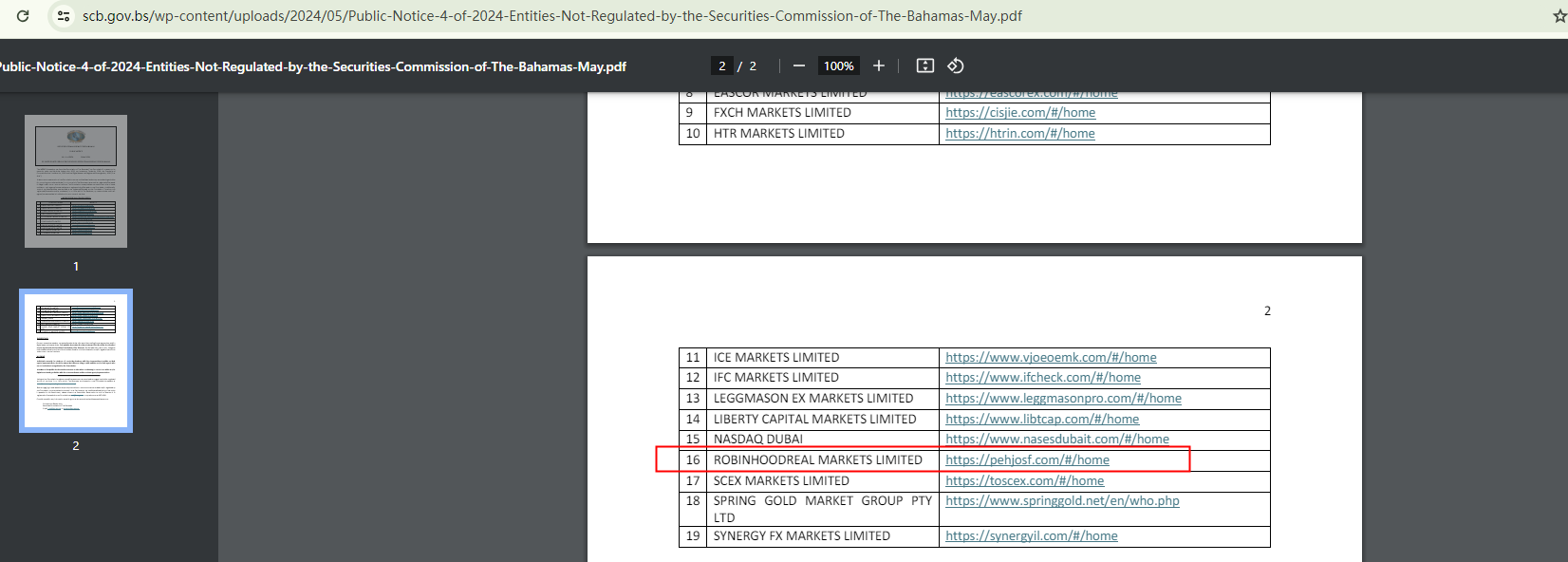 The most compelling evidence comes when the Securities Commission of the Bahamas (SCB) adds RobinHoodReal to its warning list, refuting the broker's false claims of being regulated by them.