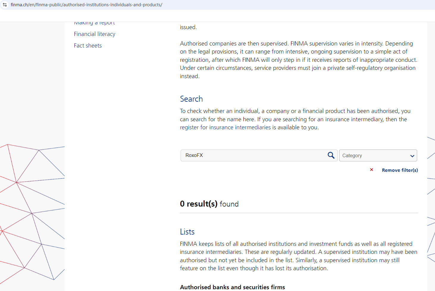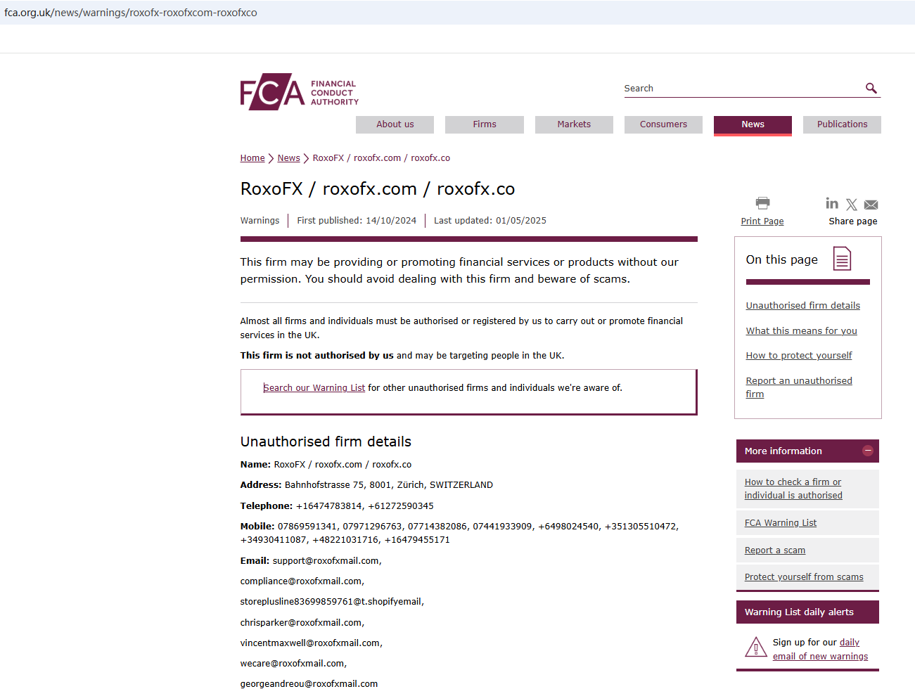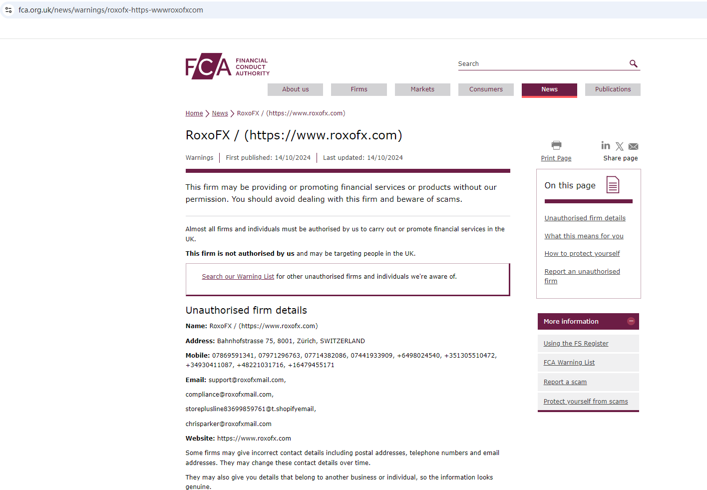 According to its website, it is located in the Switzerland. Upon investigation, no matching information was found in the Swiss Financial Market Supervisory Authority (Swiss FINMA).What's more, the Financial Conduct Authority (FCA) issued a warning against RoxoFX, believing this company might be providing financial services or products without proper authorization in the UK.In essence, RoxoFX is not regulated by any governing body. Entrusting it with investors' funds is highly risky, as there are no legal protections in place to safeguard the funds.RoxoFX appears to be a scam.