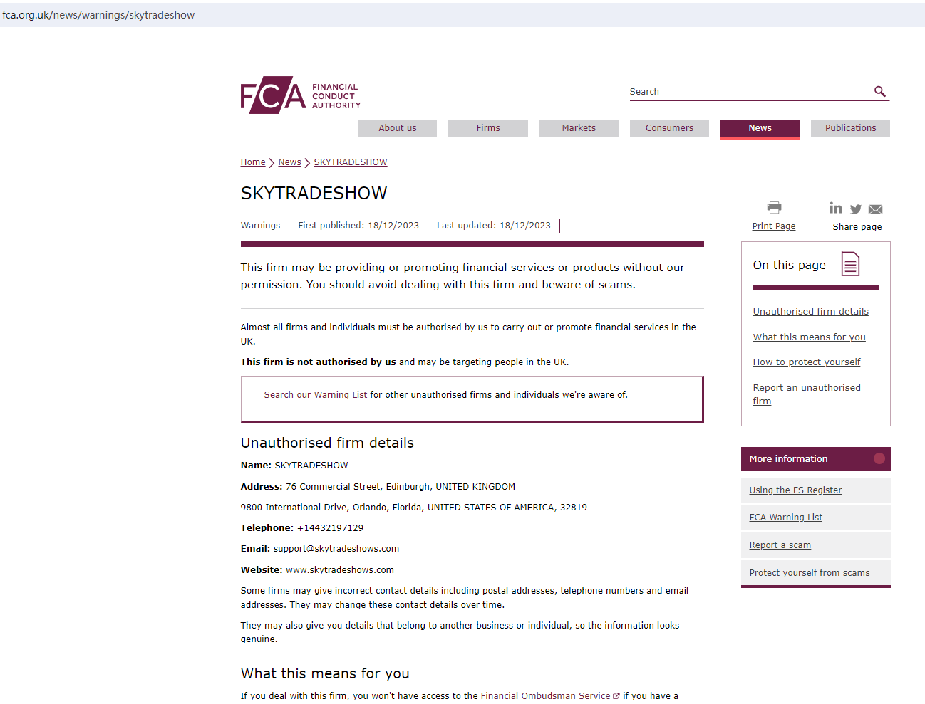 In addition, the United Kingdom Financial Conduct Authority (UK FCA) issued a warning that SKYTRADESHOW was providing financial services or products in the UK without authorisation.