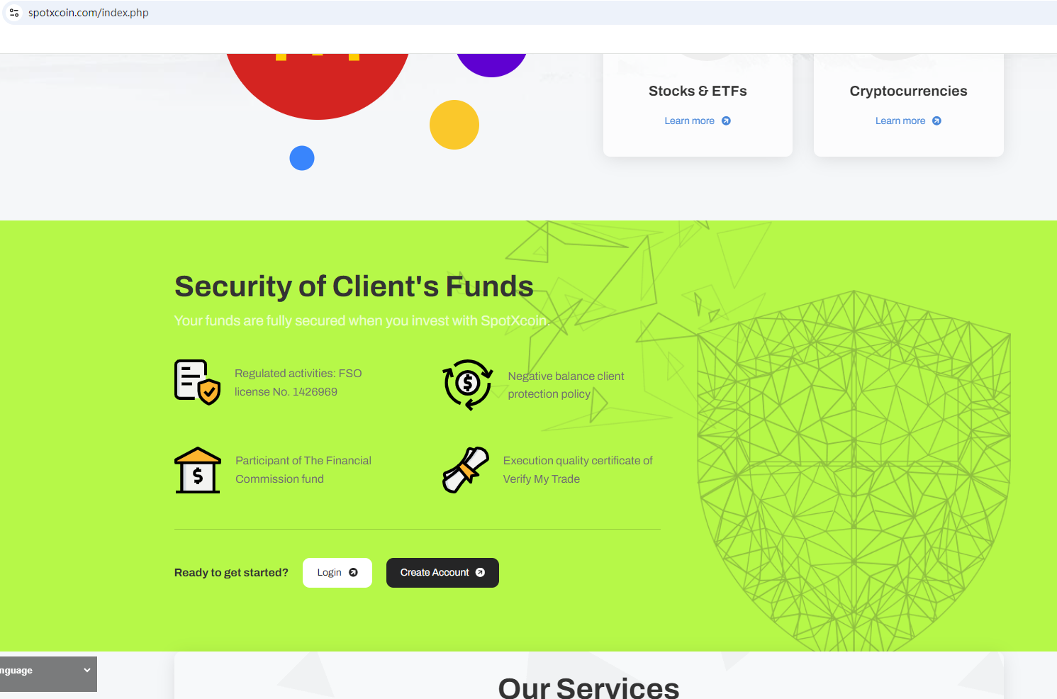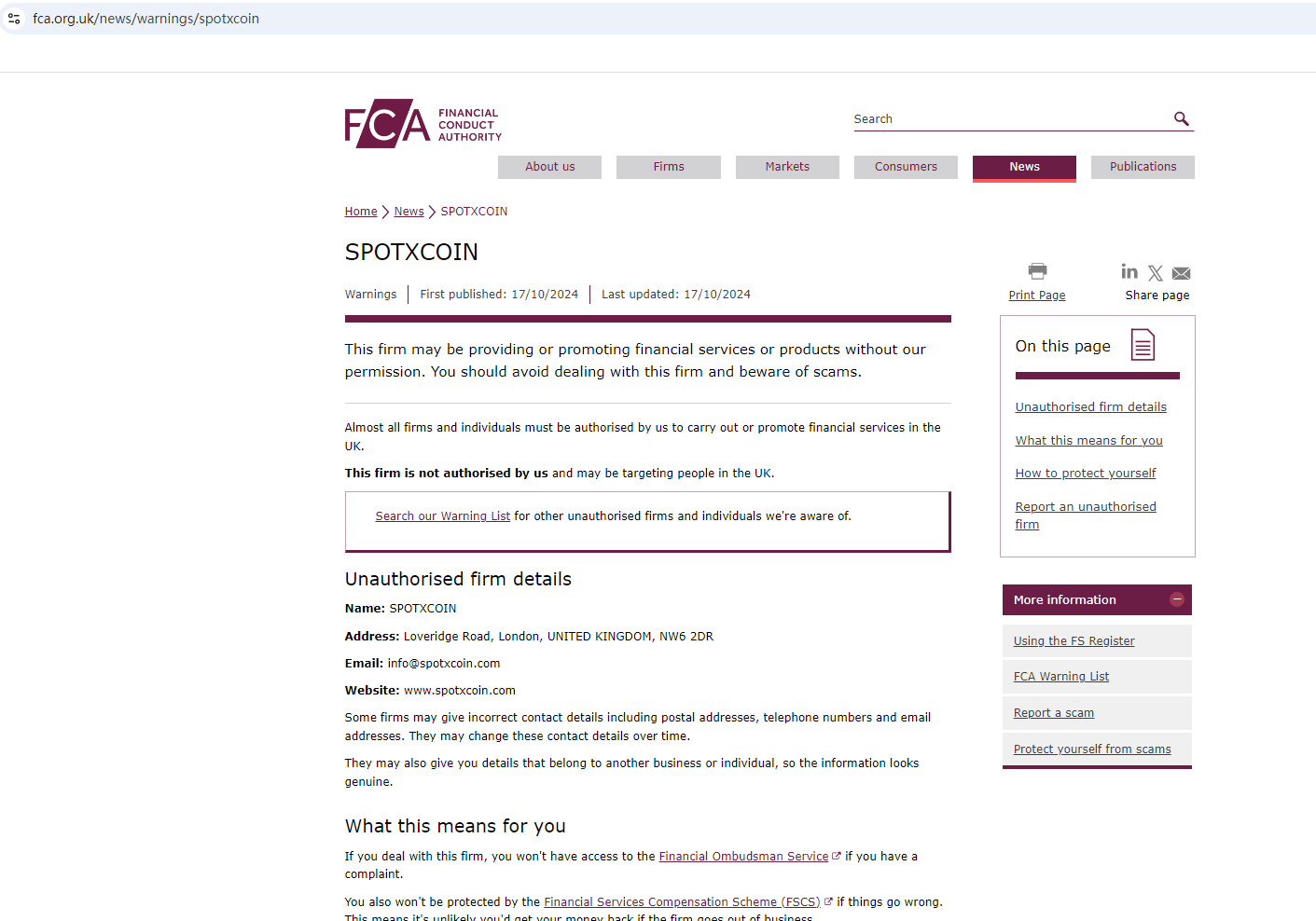 According to its website, it claims to be a reliable company. It displays the Financial Services Ombudsman (FSO) number online, but FSO does not have the authority to regulate foreign exchange. Apart from this, no other valid regulatory content is displayed on the website.In addition, the United Kingdom Financial Conduct Authority (FCA) issued a warning against SPOTXCOIN, believing this company might be providing financial services or products without authorisation in the UK.The truth is that SPOTXCOIN is not regulated by any regulators. Letting it hold or control investors'money is unsafe, and the money can not be protected by any laws.SPOTXCOIN is a scam.