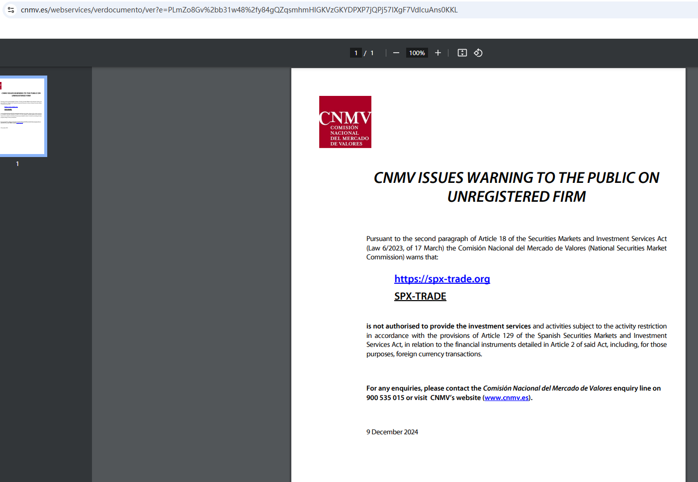 In addition, the Comisión Nacional del Mercado de Valores (CNMV) added SPX Trade to its warning list for providing investment services without authorization.