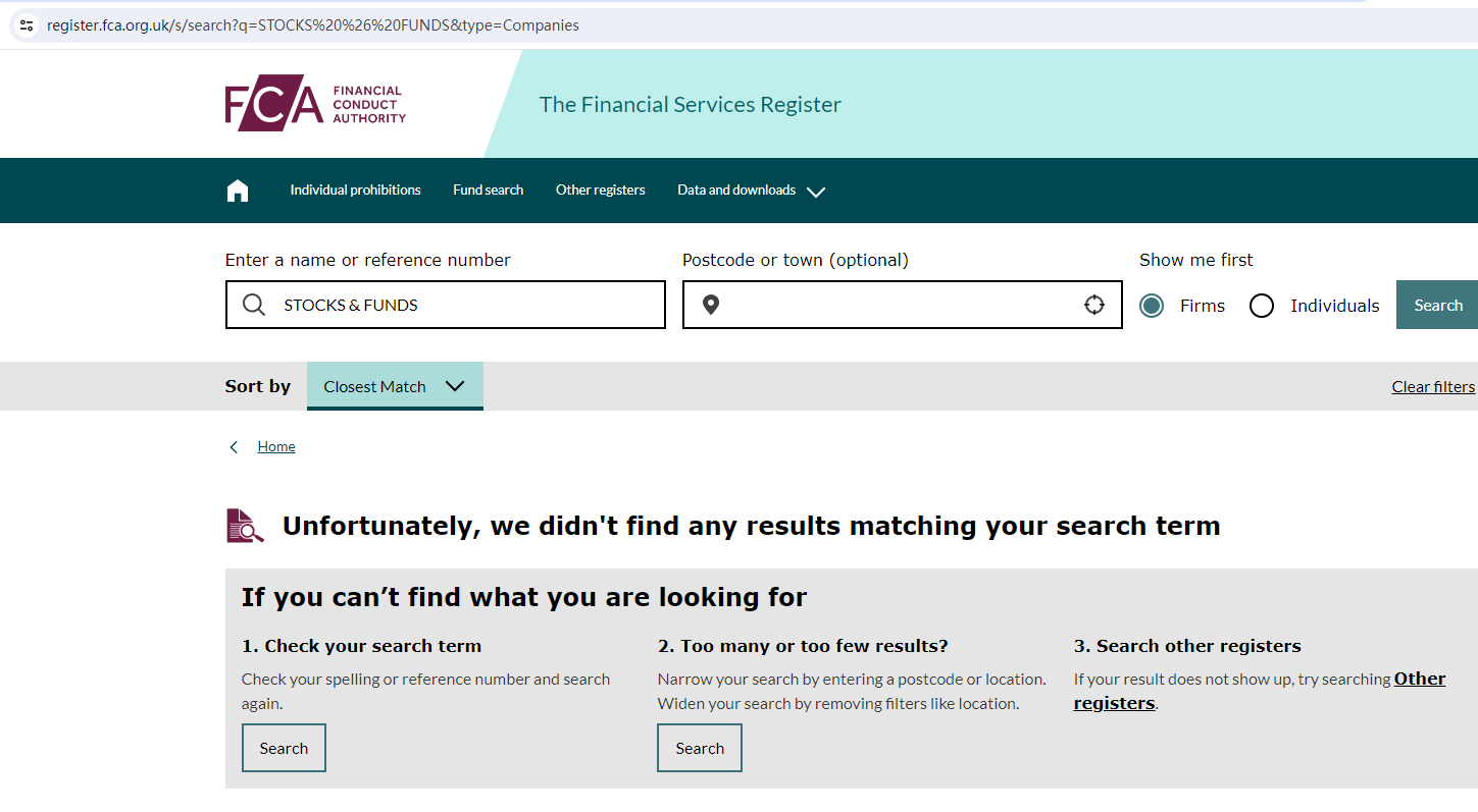 STOCKS FUNDS locates in the United Kingdom, so we searched the UK Financial Conduct Authority (UK FCA) but found no matching results.