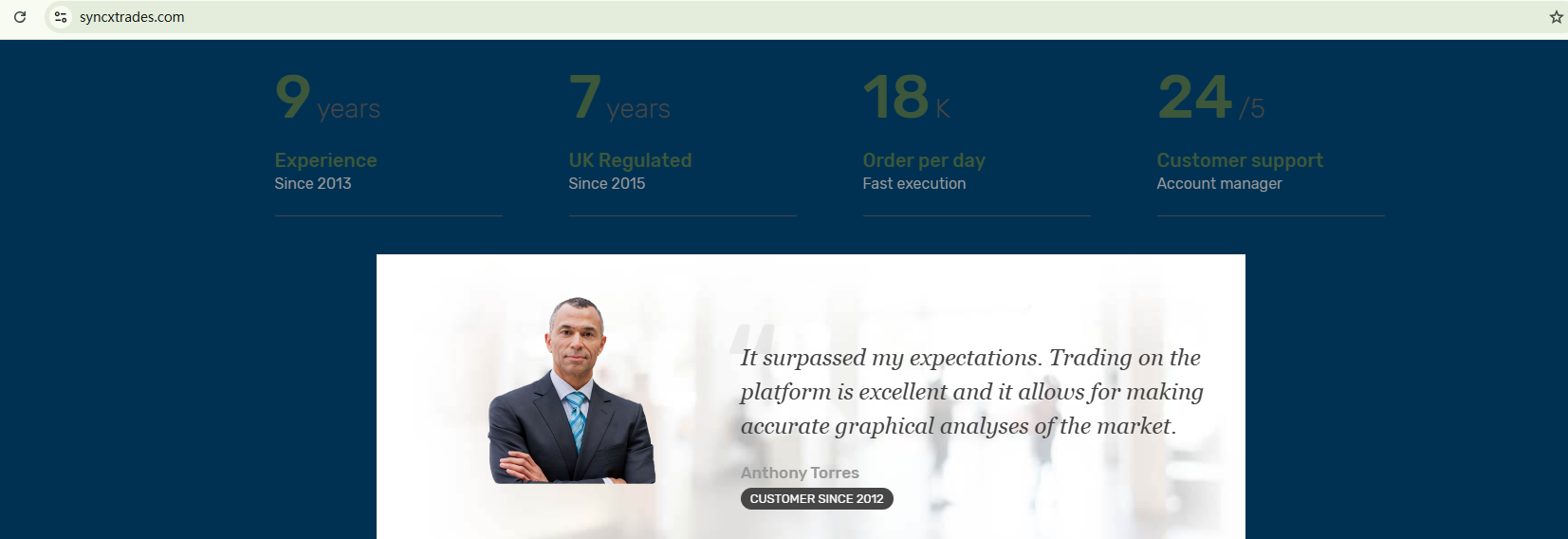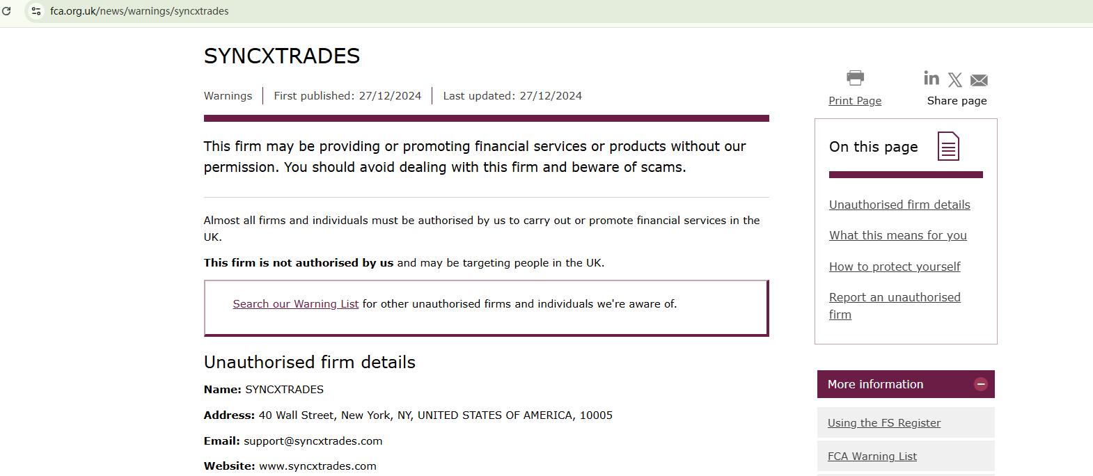 In reality, SYNCXTRADES is not regulated by any governing body. Entrusting your funds to this broker is extremely risky as there are no legal protections to safeguard your investments. SYNCXTRADES appears to be a scam.