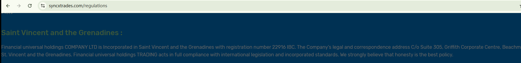 The website of SYNCXTRADES is riddled with falsehoods. First, the broker claims to have been in business since 2013, yet its domain name was only registered in February 2024. Second, it alleges seven years of UK regulation, but the Financial Conduct Authority (FCA) has issued a warning refuting this claim. Lastly, the company behind SYNCXTRADES refers to itself as Financial Universal holdings COMPANY LTD, allegedly having registration number 22916 IBC in St. Vincent and the Grenadines. However, the firm linked to this number is AAFX TRADING COMPANY LTD, which bears no responsibility for SYNCXTRADES.