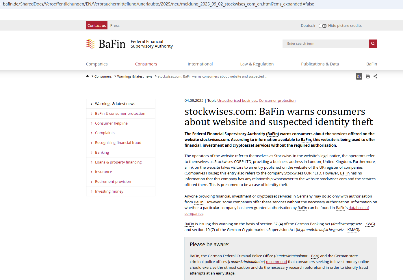 On Sept 4, 2025, the Federal Financial Supervisory Authority (BaFin) issued a warning against Stockwise for the lack of the required authorization. https://www.bafin.de/SharedDocs/Veroeffentlichungen/EN/Verbrauchermitteilung/unerlaubte/2025/neu/meldung_2025_09_02_stockwises_com_en.html?cms_expanded=false