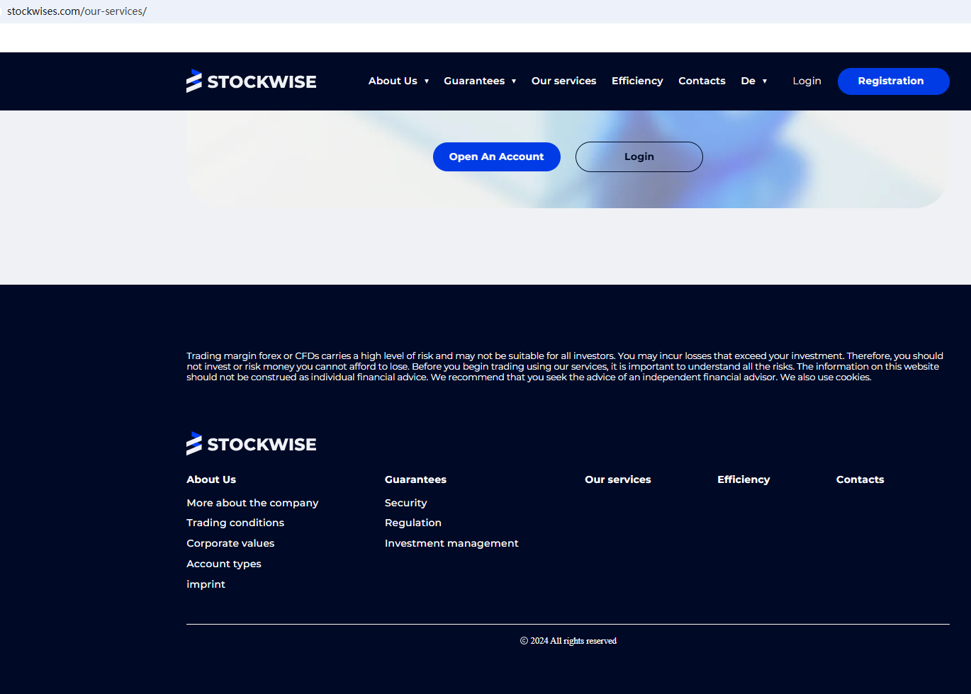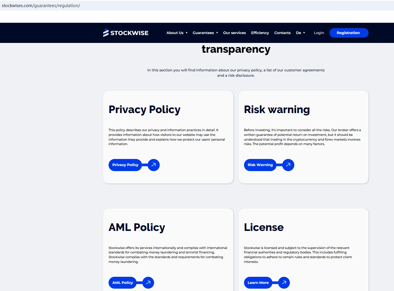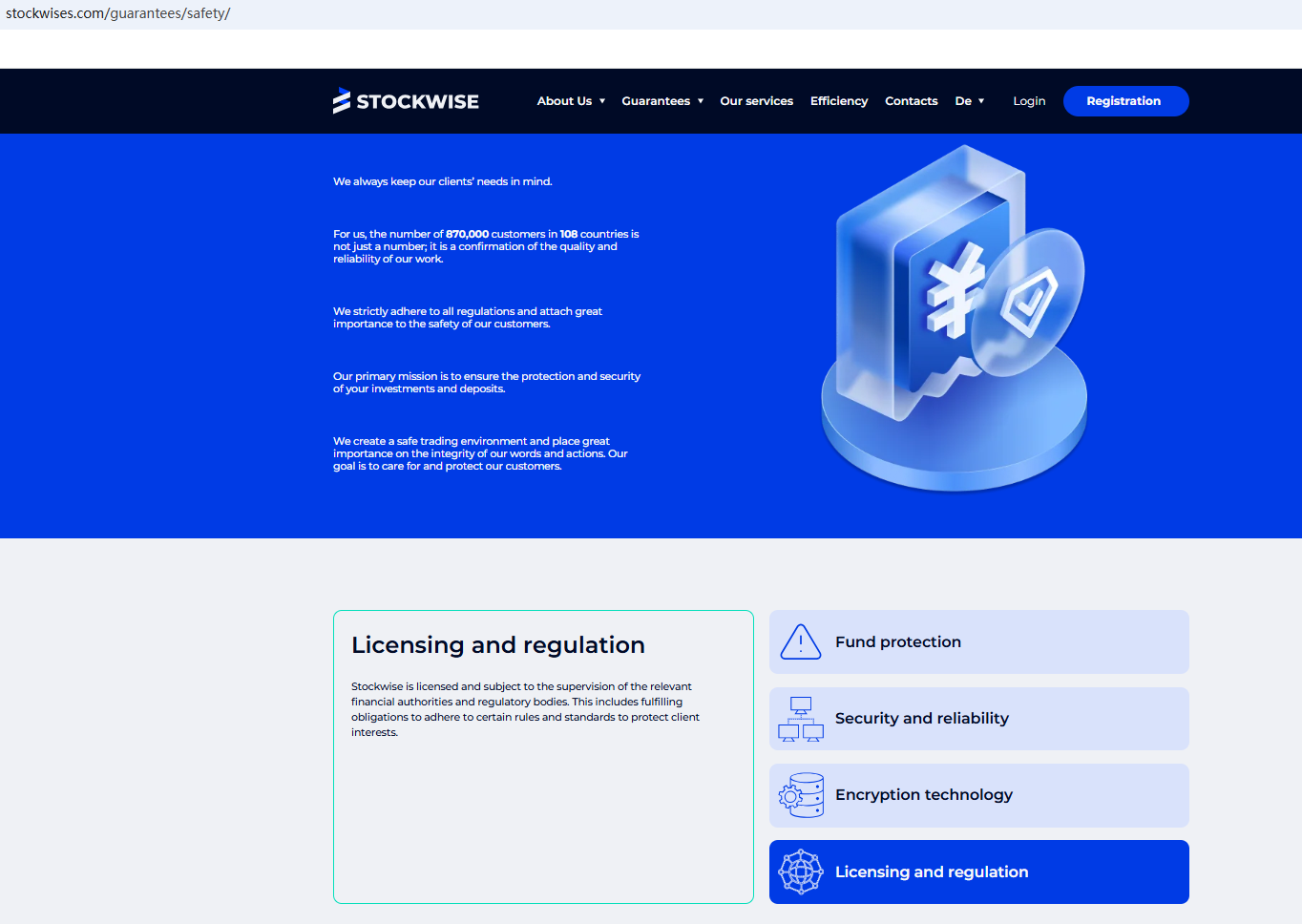 It claims on its website that it is regulated by relevant regulatory bodies, but it does not display any of the regulatory body's certificates or specific regulatory information. Even the most basic office address is not disclosed, which is extremely unreliable. In addition, the Federal Financial Supervisory Authority (BaFin) issued a warning against Stockwise for the lack of the required authorization.