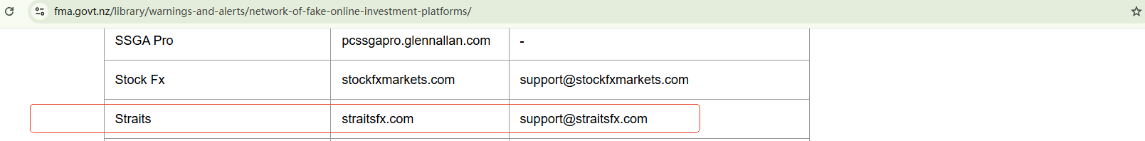 On February 17, 2025, the New Zealand Financial Markets Authority (NZ FMA) released a warning list, advising investors to stay vigilant about 96 suspicious investment websites including Straits. https://www.fma.govt.nz/library/warnings-and-alerts/network-of-fake-online-investment-platforms/