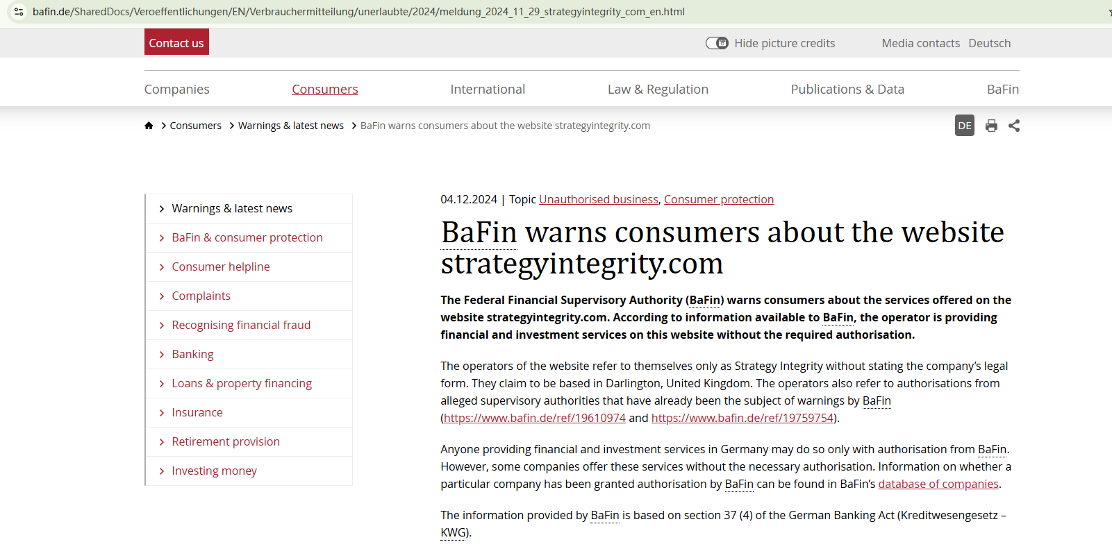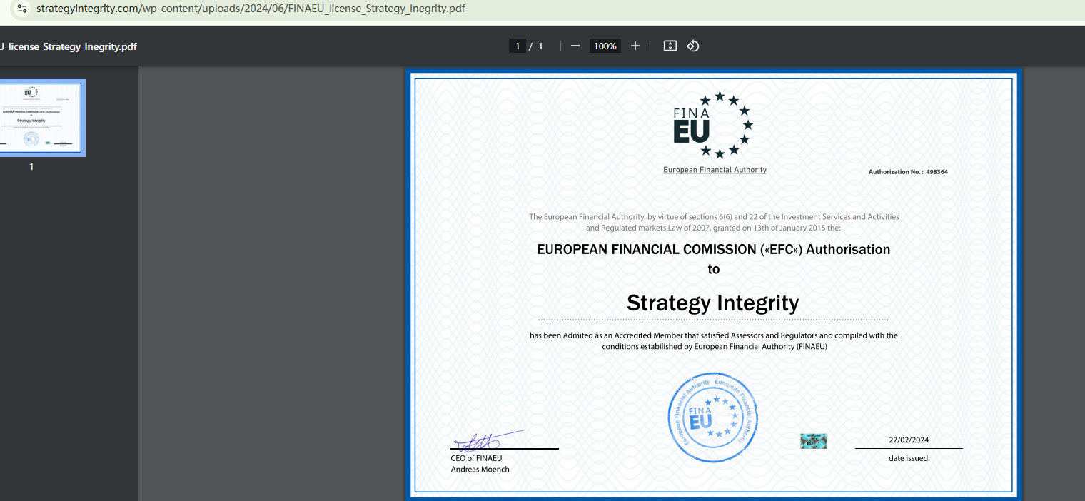 Strategy Integrity appears to be a new trading platform, with its domain name registered in late June 2024. It has provided registration or licensing information in the footer to demonstrate its legitimacy and compliance, each with a URL linking to the specific certificate page. However, we have discovered that all these certificates come from fake authorities, such as FISEU, FINA EU, and CADFIRA. Additionally, the Federal Financial Supervisory Authority (BaFin) has issued a warning highlighting all the suspicious points and advising investors to avoid Strategy Integrity.