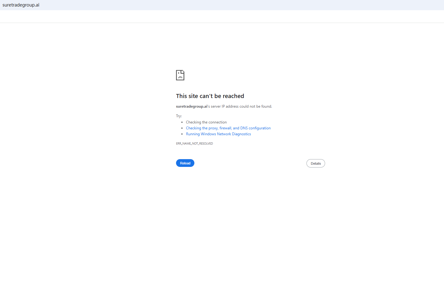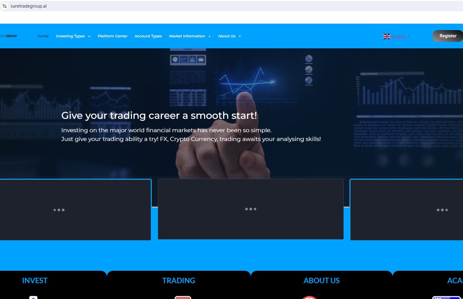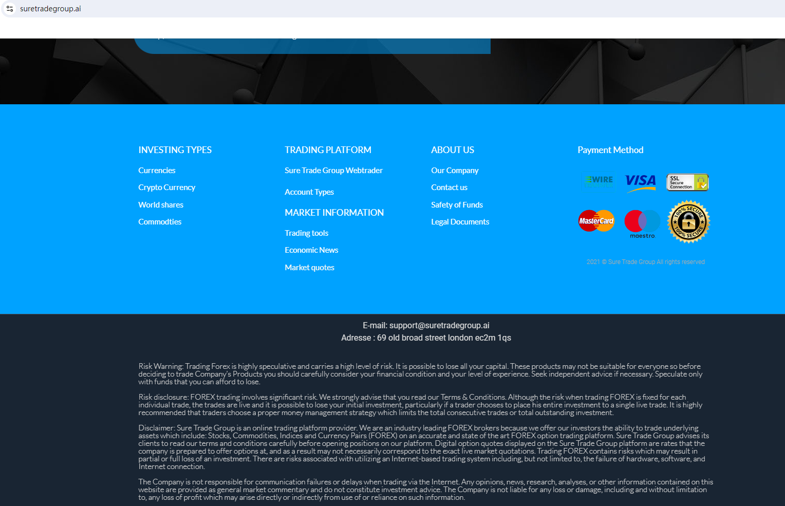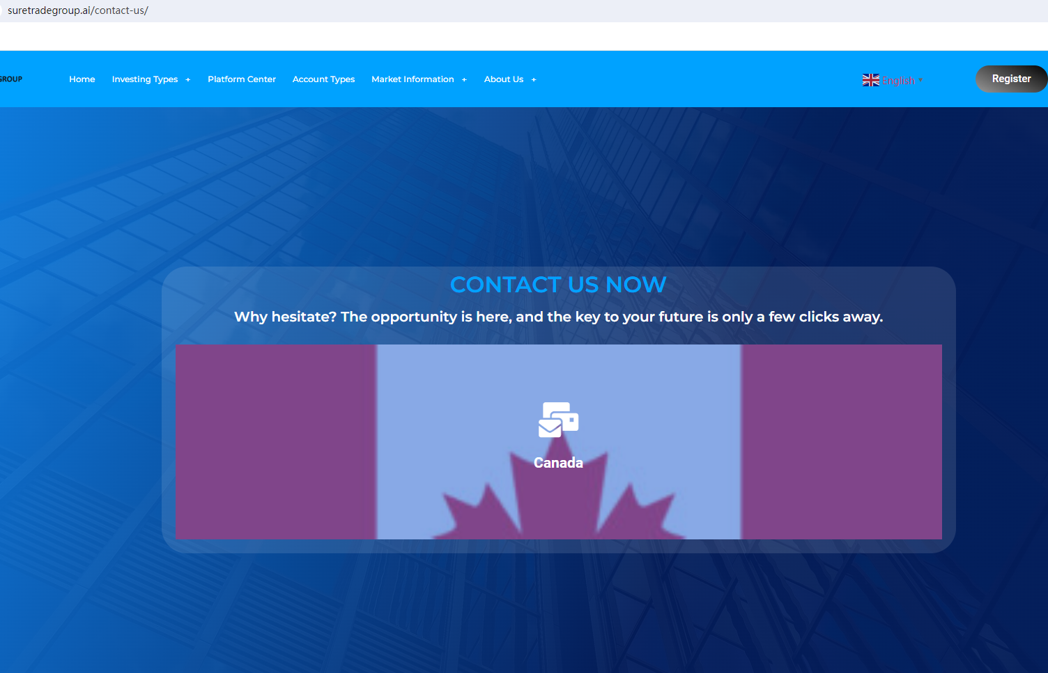 According to its website, it is located in Canada. Upon investigation, no matching information was found in the Investment Industry Regulatory Organization of Canada (IIROC).In addition, the BC Securities Commission Invest Right (BCSC) issued a warning against Sure Trade Group believing this company might be providing financial services or products without proper authorization.In essence, Sure Trade Group is not regulated by any governing body. Entrusting it with investors' funds is highly risky, as there are no legal protections in place to safeguard the funds.Sure Trade Group appears to be a scam.