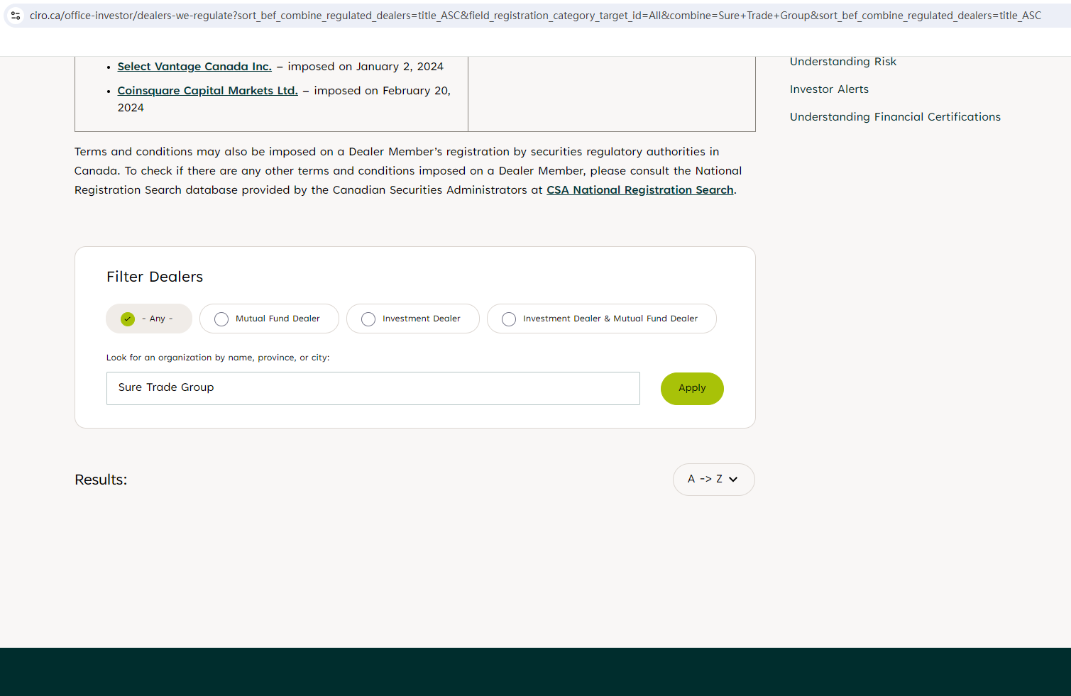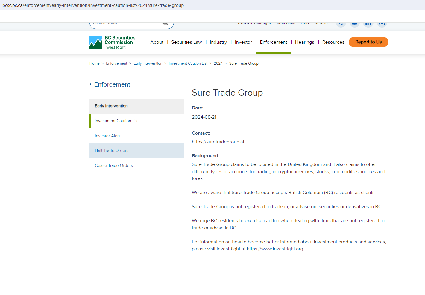 In addition, the BC Securities Commission Invest Right (BCSC) issued a warning against Sure Trade Group believing this company might be providing financial services or products without proper authorization.