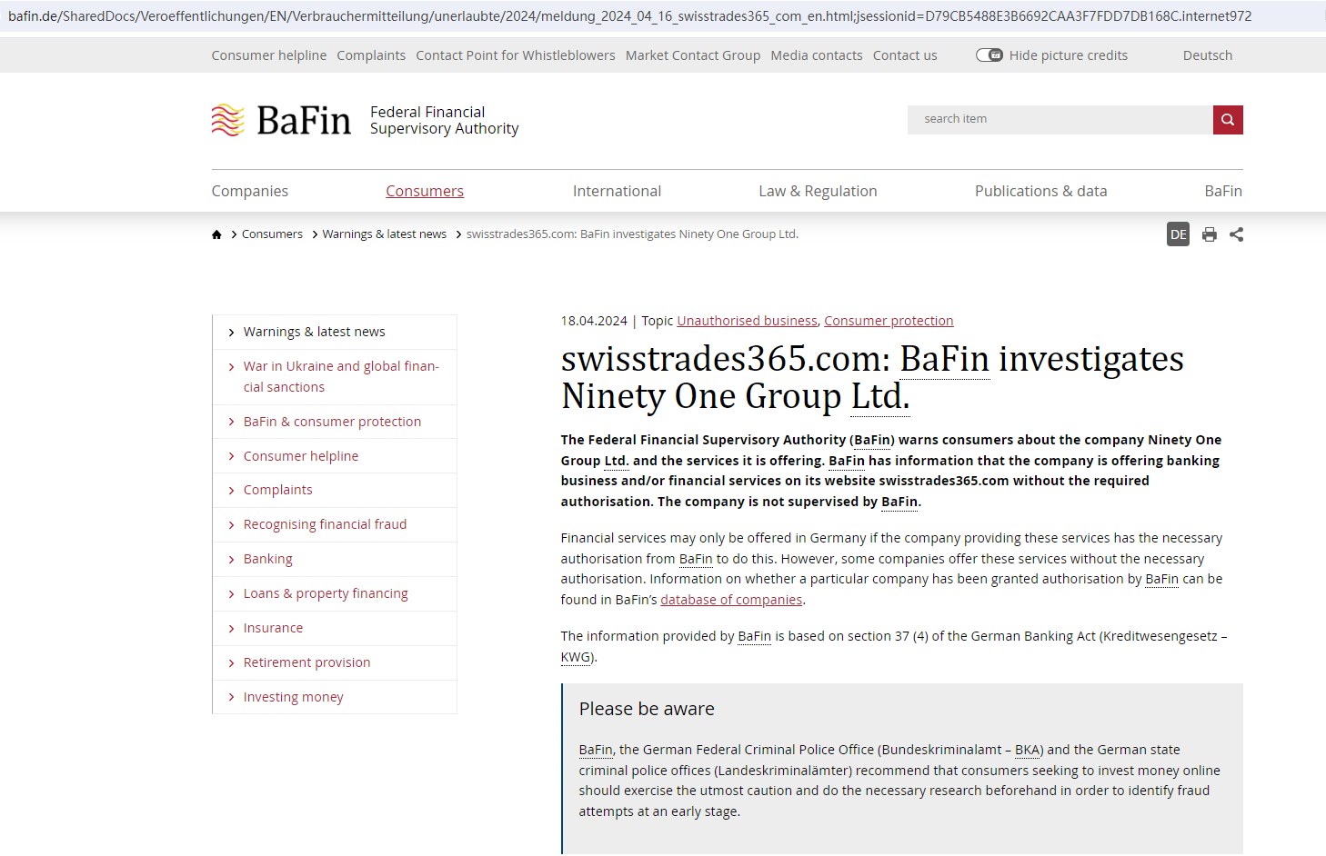 And the Federal Financial Supervisory Authority (BaFin) issued a warning against swisstrades365.com, believing the company Ninety One Group Ltd is providing financial and investment services on this website without the required authorisation.